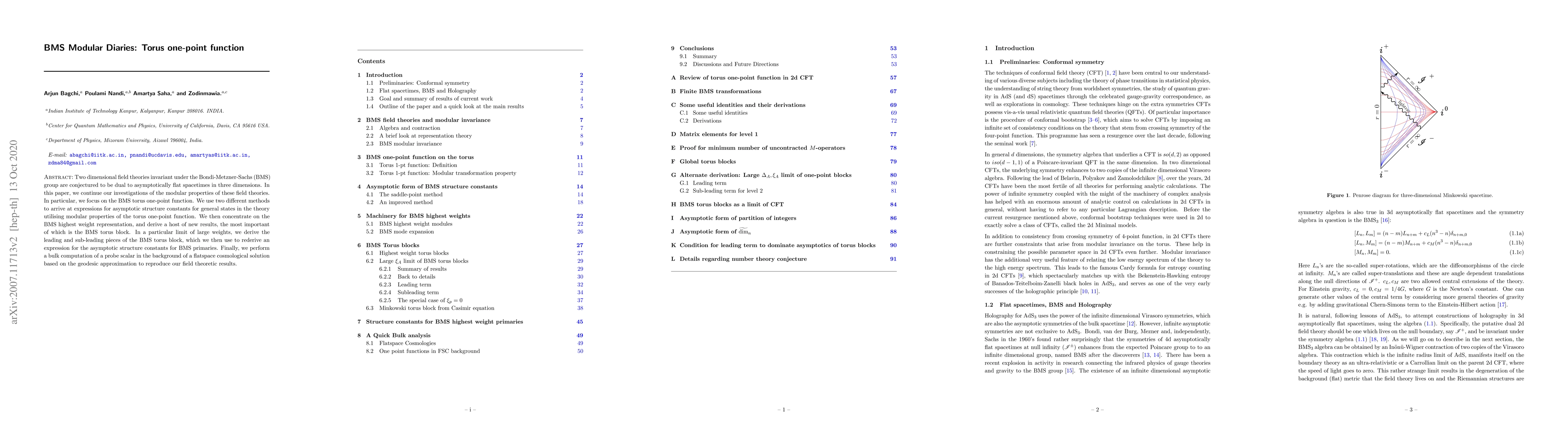 Two dimensional field theories invariant under the Bondi-Metzner-Sachs (BMS) group are conjectured to be dual to asymptotically flat spacetimes in three dimensions. In this paper, we continue our investigations of the modular properties of these field theories. In particular, we focus on the BMS torus one-point function. We use two different methods to arrive at expressions for asymptotic structure constants for general states in the theory utilising modular properties of the torus one-point function. We then concentrate on the BMS highest weight representation, and derive a host of new results, the most important of which is the BMS torus block. In a particular limit of large weights, we derive the leading and sub-leading pieces of the BMS torus block, which we then use to rederive an expression for the asymptotic structure constants for BMS primaries. Finally, we perform a bulk computation of a probe scalar in the background of a flatspace cosmological solution based on the geodesic approximation to reproduce our field theoretic results.