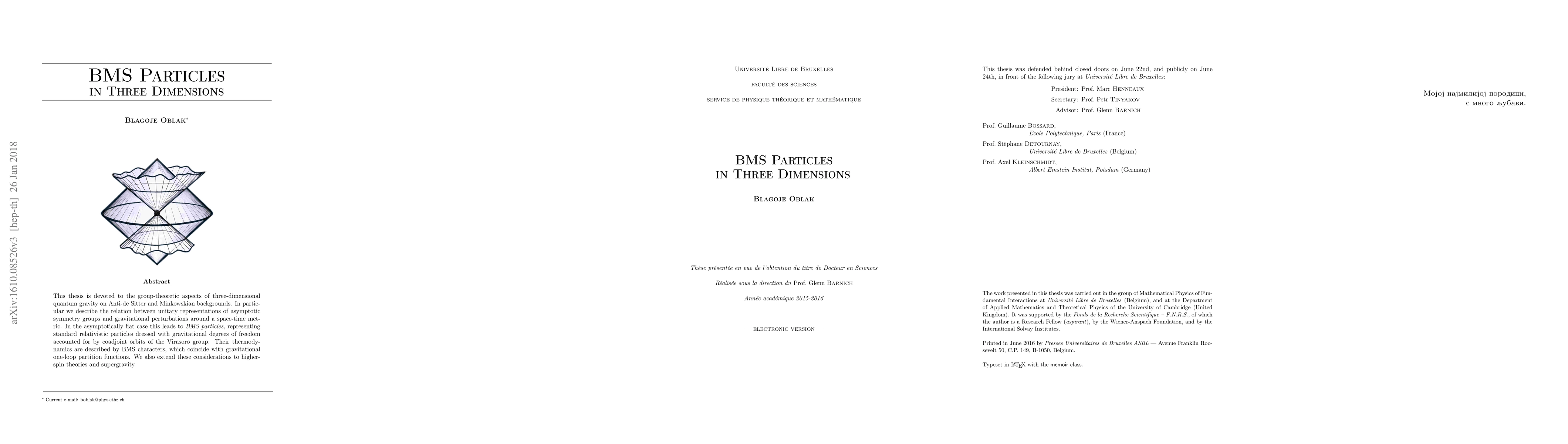This paper explores the group-theoretic aspects of three-dimensional quantum gravity, focusing on the connection between unitary representations of asymptotic symmetry groups and gravitational perturbations. It introduces "BMS particles" in asymptotically flat space-time, characterized by Virasoro group coadjoint orbits, and discusses their thermodynamic properties via BMS characters.
