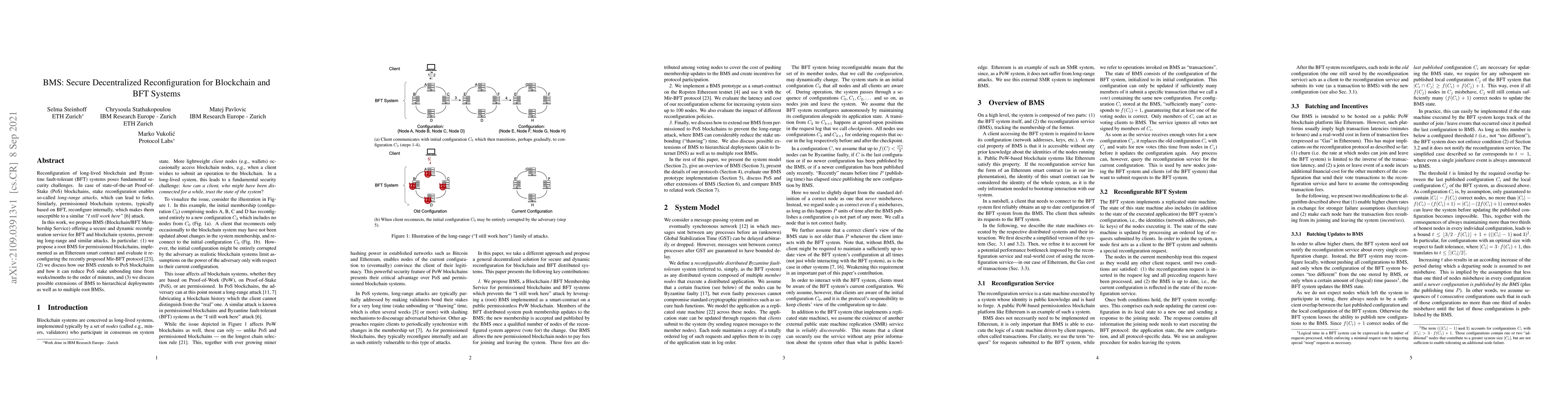 This paper proposes BMS, a secure decentralized reconfiguration service for blockchain and BFT systems, to prevent long-range attacks and forks, with potential benefits including reduced PoS stake unbonding time.