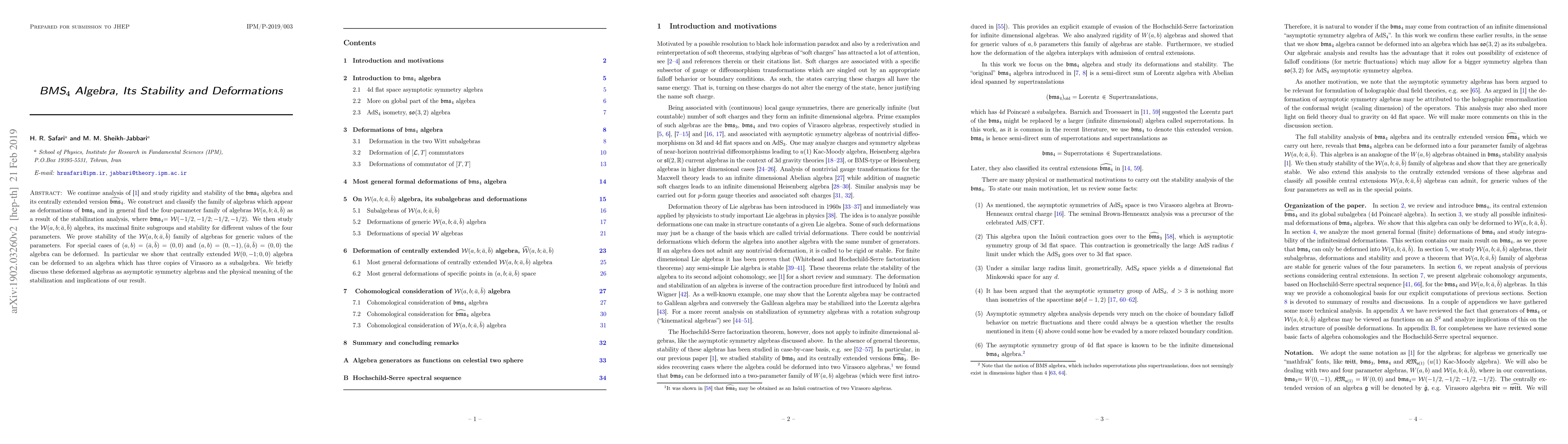 Researchers studied the BMS4 algebra and its deformations, finding a four-parameter family of stable algebras known as W(a,b;{ar{a}},{ar{b}}) that can be deformed under certain conditions.