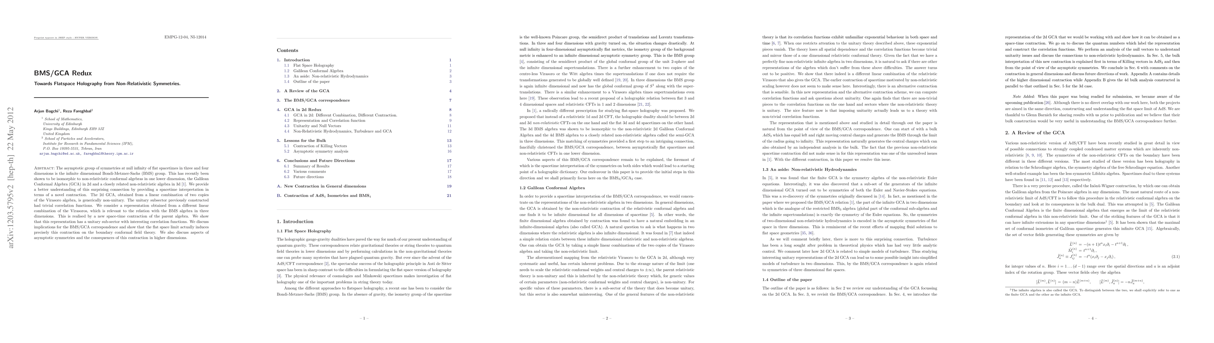 The asymptotic group of symmetries at null infinity of flat spacetimes in three and four dimensions is the infinite dimensional Bondi-Metzner-Sachs (BMS) group. This has recently been shown to be isomorphic to non-relativistic conformal algebras in one lower dimension, the Galilean Conformal Algebra (GCA) in 2d and a closely related non-relativistic algebra in 3d [1]. We provide a better understanding of this surprising connection by providing a spacetime interpretation in terms of a novel contraction. The 2d GCA, obtained from a linear combination of two copies of the Virasoro algebra, is generically non-unitary. The unitary subsector previously constructed had trivial correlation functions. We consider a representation obtained from a different linear combination of the Virasoros, which is relevant to the relation with the BMS algebra in three dimensions. This is realised by a new space-time contraction of the parent algebra. We show that this representation has a unitary sub-sector with interesting correlation functions. We discuss implications for the BMS/GCA correspondence and show that the flat space limit actually induces precisely this contraction on the boundary conformal field theory. We also discuss aspects of asymptotic symmetries and the consequences of this contraction in higher dimensions.
