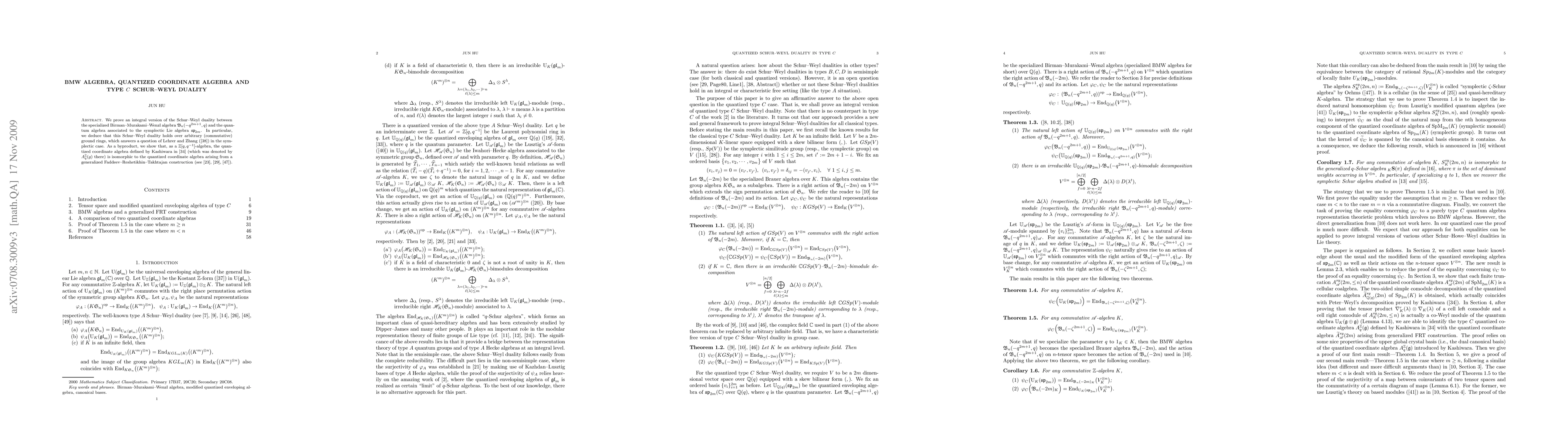 This paper establishes an integral Schur-Weyl duality between the Birman-Murakami-Wenzl algebra and a quantum algebra related to symplectic Lie algebra, demonstrating its validity over any commutative ground ring. Additionally, it proves an isomorphism between two quantized coordinate algebras from different constructions.