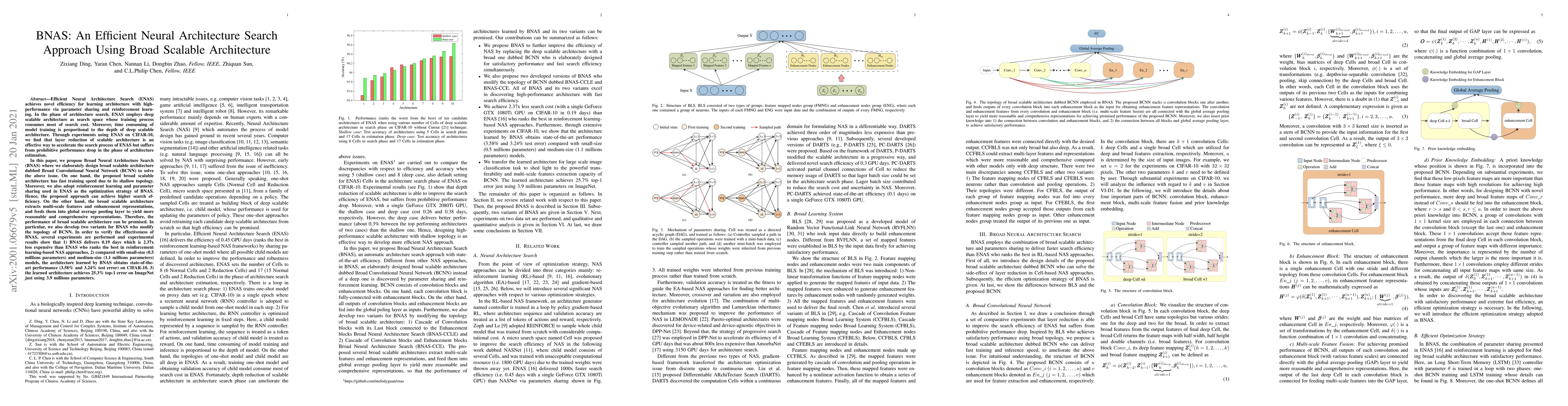 The paper proposes Broad Neural Architecture Search (BNAS) with a broad scalable architecture called Broad Convolutional Neural Network (BCNN) that achieves higher search efficiency through fast training and multi-scale feature extraction. Experimental results show BNAS is 2.37x less expensive than ENAS, achieving state-of-the-art performance on CIFAR-10 and ImageNet with fewer parameters.