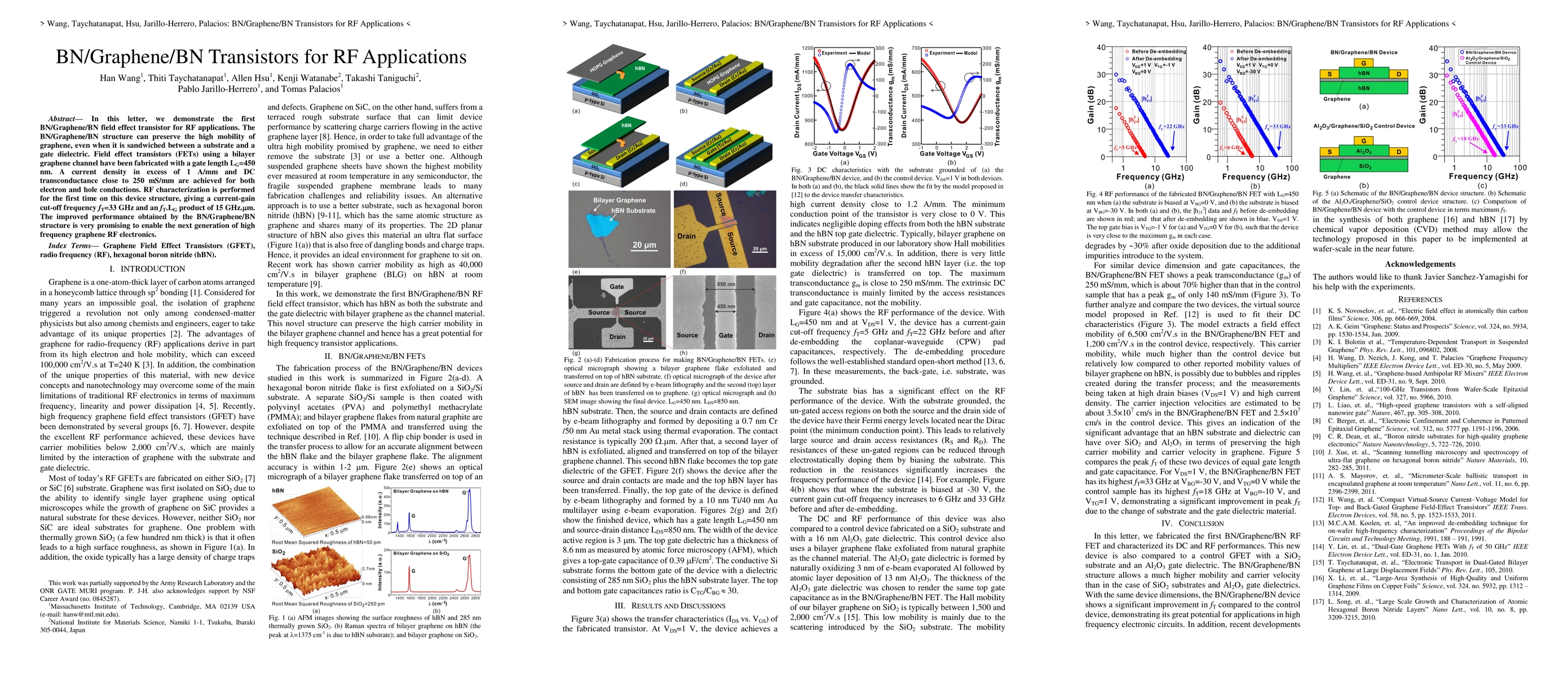 This paper presents the first BN/Graphene/BN field effect transistor for RF applications, achieving high mobility preservation and a current-gain cut-off frequency of 33 GHz, indicating potential for next-generation high-frequency graphene RF electronics.