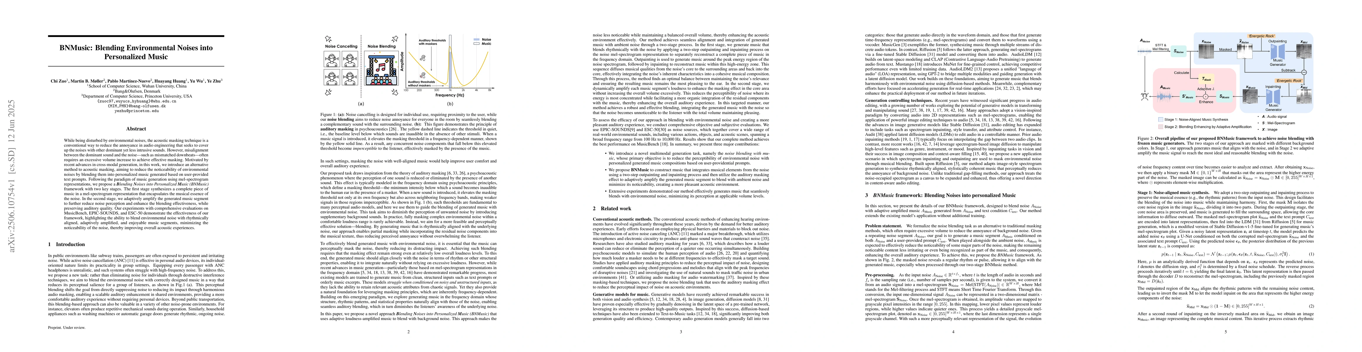 While being disturbed by environmental noises, the acoustic masking technique is a conventional way to reduce the annoyance in audio engineering that seeks to cover up the noises with other dominant yet less intrusive sounds. However, misalignment between the dominant sound and the noise-such as mismatched downbeats-often requires an excessive volume increase to achieve effective masking. Motivated by recent advances in cross-modal generation, in this work, we introduce an alternative method to acoustic masking, aiming to reduce the noticeability of environmental noises by blending them into personalized music generated based on user-provided text prompts. Following the paradigm of music generation using mel-spectrogram representations, we propose a Blending Noises into Personalized Music (BNMusic) framework with two key stages. The first stage synthesizes a complete piece of music in a mel-spectrogram representation that encapsulates the musical essence of the noise. In the second stage, we adaptively amplify the generated music segment to further reduce noise perception and enhance the blending effectiveness, while preserving auditory quality. Our experiments with comprehensive evaluations on MusicBench, EPIC-SOUNDS, and ESC-50 demonstrate the effectiveness of our framework, highlighting the ability to blend environmental noise with rhythmically aligned, adaptively amplified, and enjoyable music segments, minimizing the noticeability of the noise, thereby improving overall acoustic experiences.