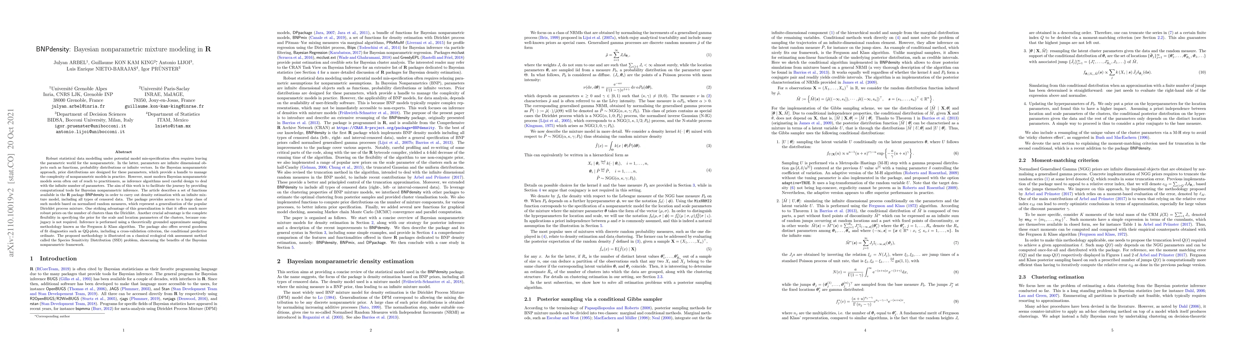 The BNPdensity R package facilitates Bayesian nonparametric mixture modeling for density estimation, offering robust priors and flexibility for censored data. It employs the Ferguson & Klass algorithm for inference and includes diagnostics like QQ-plots, demonstrated through an ecological risk assessment example.