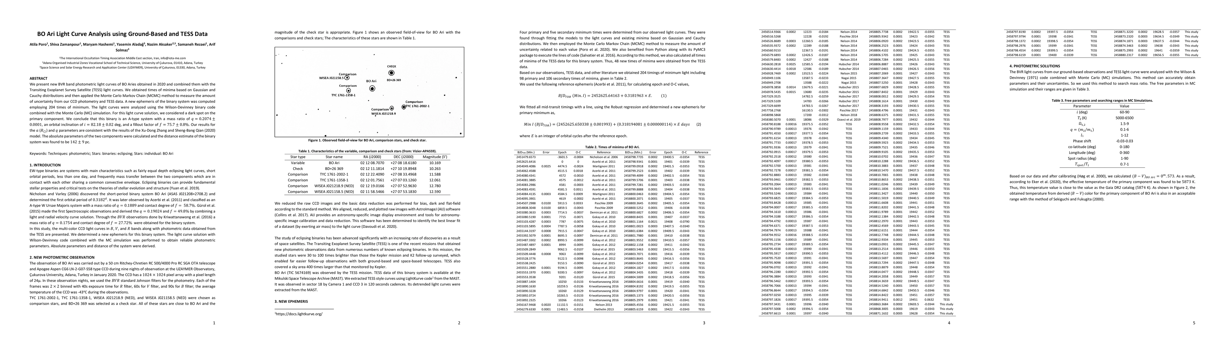 This paper analyzes new BVR band light curves of BO Ari, combining ground-based and TESS data to determine times of minima and compute a new ephemeris. The study concludes that BO Ari is an A-type binary system with a mass ratio of q=0.2074±0.0001 and an orbital inclination of i=82.18±0.02 degrees.