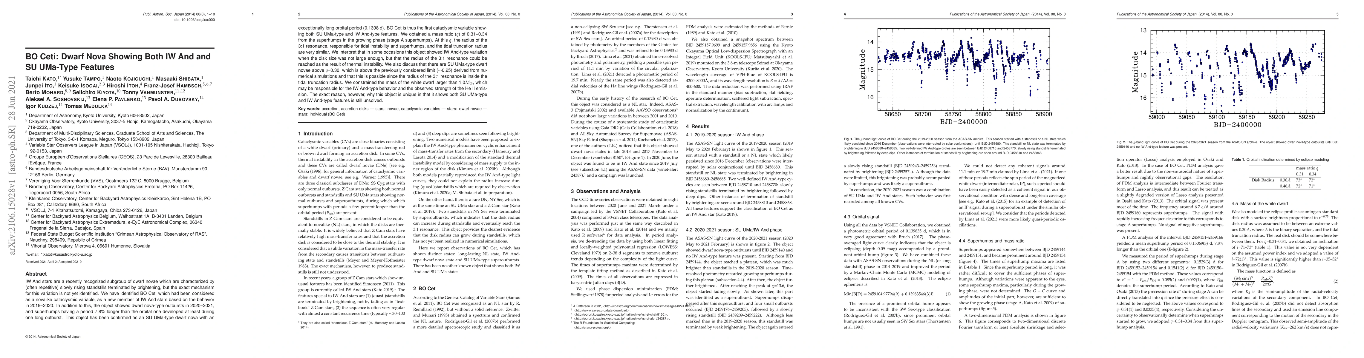 BO Ceti has been identified as a new member of IW And stars, exhibiting both SU UMa-type dwarf nova outbursts and IW And-type slowly rising standstills, making it the first known cataclysmic variable to display both features. The mass ratio and orbital period suggest a complex interaction between thermal and tidal instabilities.