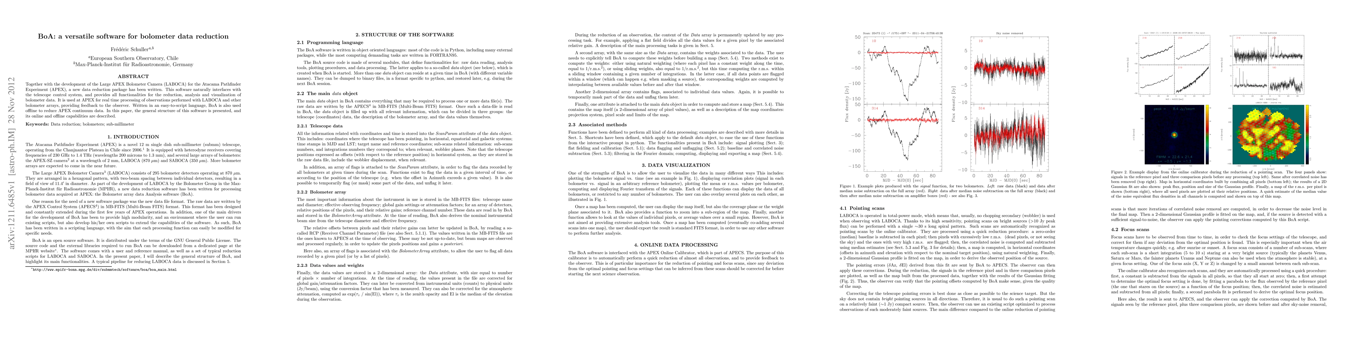 The paper describes BoA, a software package developed for bolometer data reduction, specifically for the Large APEX Bolometer Camera (LABOCA). It details the software's online and offline capabilities, including functionalities for data reduction, analysis, and visualization, with a focus on its use with LABOCA and other bolometer arrays at APEX.