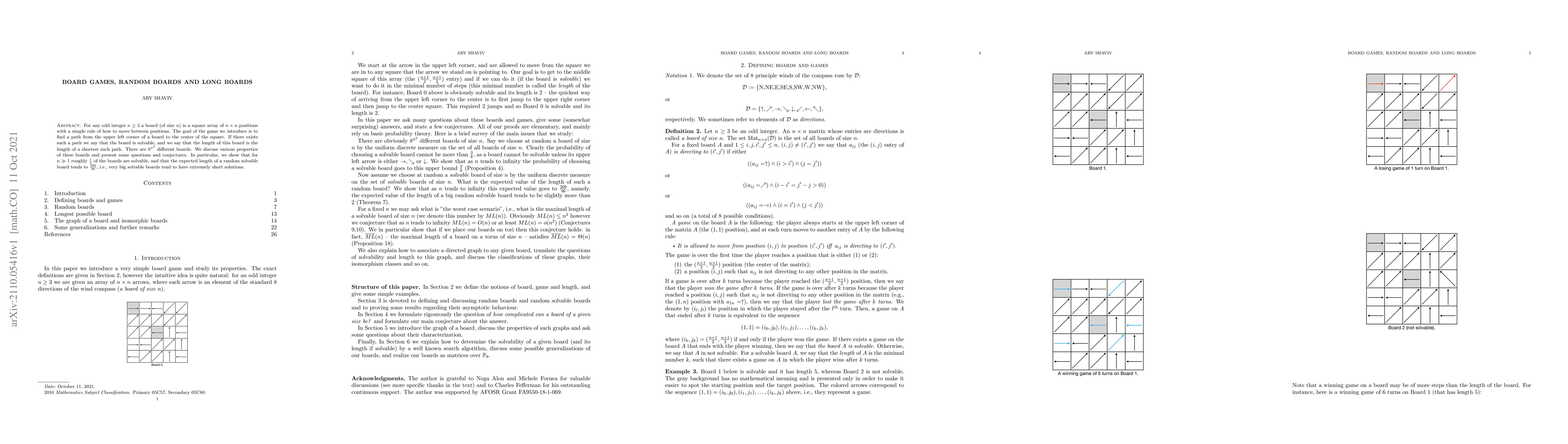 For any odd integer $n\geq3$ a board (of size $n$) is a square array of $n\times n$ positions with a simple rule of how to move between positions. The goal of the game we introduce is to find a path from the upper left corner of a board to the center of the square. If there exists such a path we say that the board is solvable, and we say that the length of this board is the length of a shortest such path. There are $8^{n^2}$ different boards. We discuss various properties of these boards and present some questions and conjectures. In particular, we show that for $n\gg1$ roughly $\frac{1}{3}$ of the boards are solvable, and that the expected length of a random solvable board tends to $\frac{209}{96}$, i.e., very big solvable boards tend to have extremely short solutions.