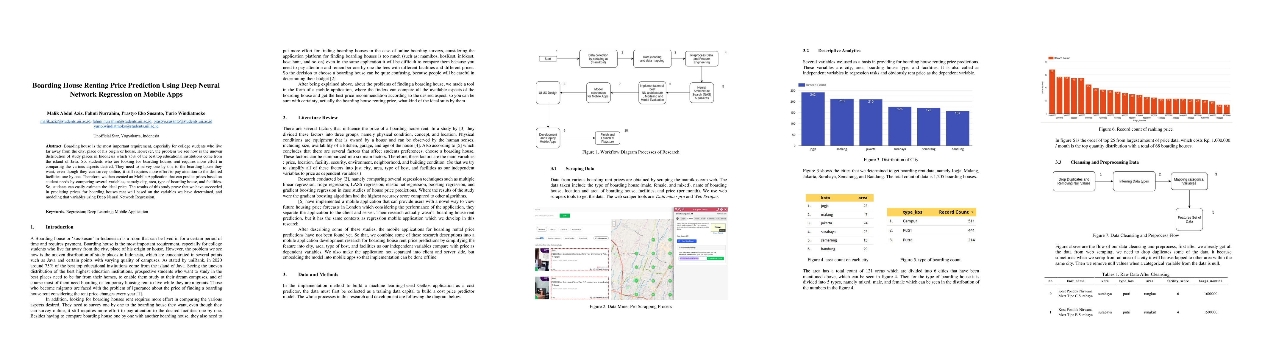Boarding house is the most important requirement, especially for college students who live far away from the city, place of his origin or house. However, the problem we see now is the uneven distribution of study places in Indonesia which 75% of the best top educational institutions come from the island of Java. So, students who are looking for boarding houses rent requires more effort in comparing the various aspects desired. They need to survey one by one to the boarding house they want, even though they can survey online, it still requires more effort to pay attention to the desired facilities one by one. Therefore, we then created an Mobile Application that can predict prices based on student needs by comparing several variables, namely city, area, type of boarding house, and facilities. So, students can easily estimate the ideal price. The results of this study prove that we have succeeded in predicting prices for boarding houses rent well based on the variables we have determined, and modeling that variables using Deep Neural Network Regression.