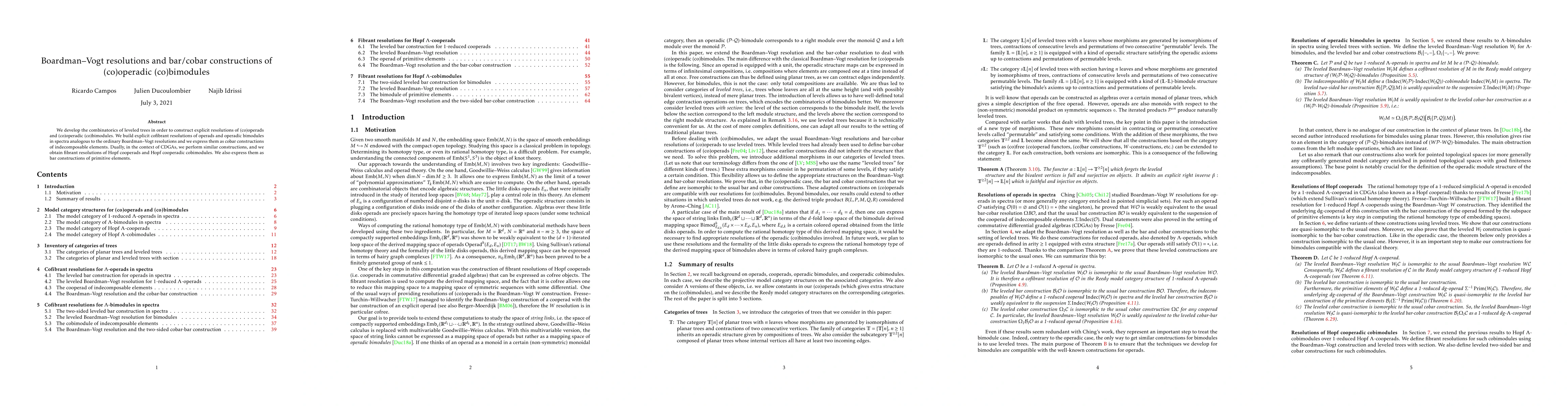 We develop the combinatorics of leveled trees in order to construct explicit resolutions of (co)operads and (co)operadic (co)bimodules. We build explicit cofibrant resolutions of operads and operadic bimodules in spectra analogous to the ordinary Boardman--Vogt resolutions and we express them as cobar constructions of indecomposable elements. Dually, in the context of CDGAs, we perform similar constructions, and we obtain fibrant resolutions of Hopf cooperads and Hopf cooperadic cobimodules. We also express them as bar constructions of primitive elements.
