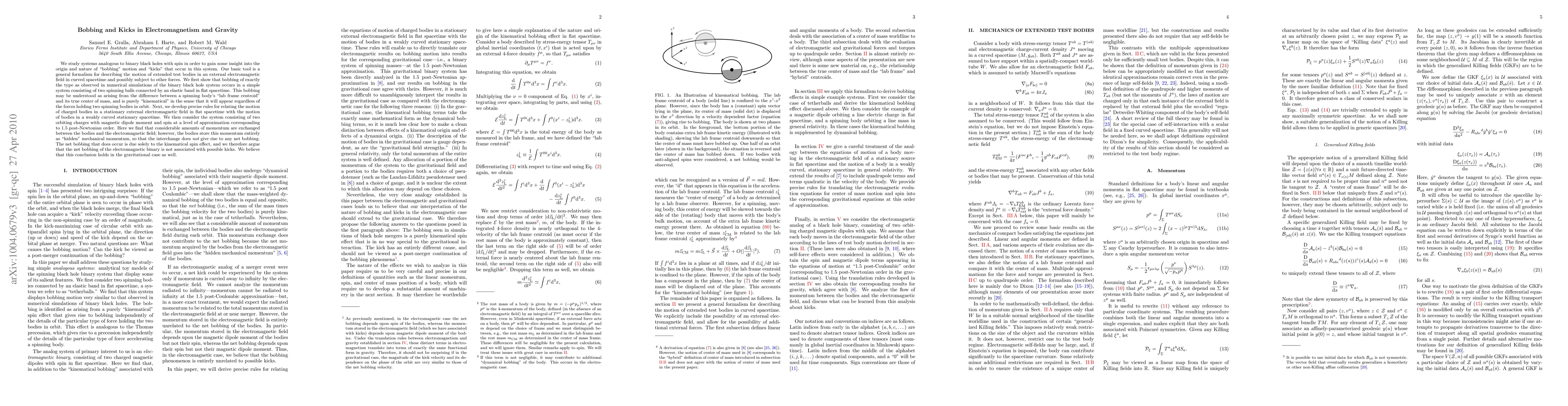 We study systems analogous to binary black holes with spin in order to gain some insight into the origin and nature of "bobbing" motion and "kicks" that occur in this system. Our basic tool is a general formalism for describing the motion of extended test bodies in an external electromagnetic field in curved spacetime and possibly subject to other forces. We first show that bobbing of exactly the type as observed in numerical simulations of the binary black hole system occurs in a simple system consisting of two spinning balls connected by an elastic band in flat spacetime. This bobbing may be understood as arising from the difference between a spinning body's "lab frame centroid" and its true center of mass, and is purely "kinematical" in the sense that it will appear regardless of the forces holding two spinning bodies in orbit. Next, we develop precise rules for relating the motion of charged bodies in a stationary external electromagnetic field in flat spacetime with the motion of bodies in a weakly curved stationary spacetime. We then consider the system consisting of two orbiting charges with magnetic dipole moment and spin at a level of approximation corresponding to 1.5 post-Newtonian order. Here we find that considerable amounts of momentum are exchanged between the bodies and the electromagnetic field; however, the bodies store this momentum entirely as "hidden" mechanical momentum, so that the interchange does not give rise to any net bobbing. The net bobbing that does occur is due solely to the kinematical spin effect, and we therefore argue that the net bobbing of the electromagnetic binary is not associated with possible kicks. We believe that this conclusion holds in the gravitational case as well.