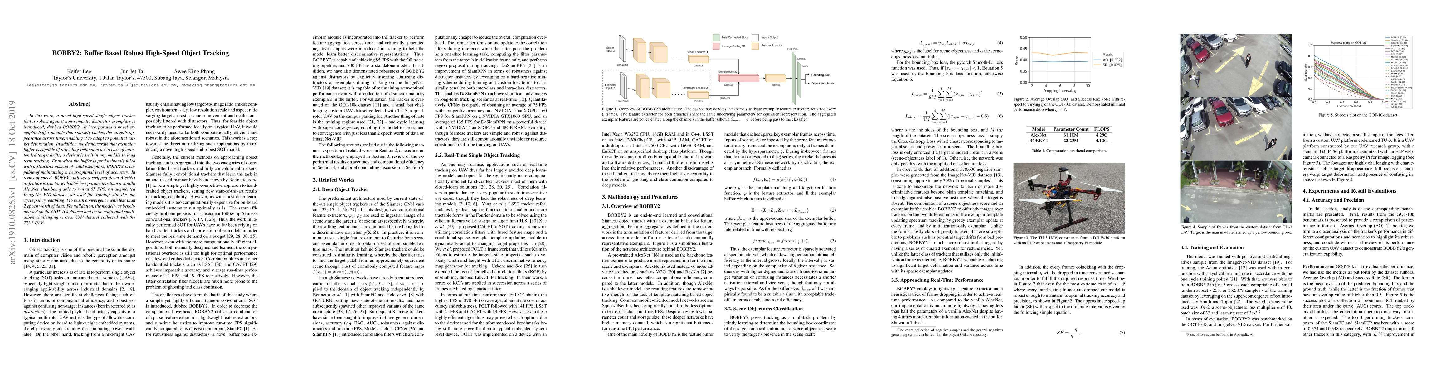 The research introduces BOBBY2, a high-speed object tracker robust to distractors. It uses an exemplar buffer to adapt to target deformation and trains on an augmented ImageNet-VID dataset, converging in less than 2 epochs. BOBBY2 performs well on GOT-10k and a custom UAV dataset, maintaining accuracy even with predistractor buffer content. It achieves competitive results without fine-tuning, running at 85 FPS using a stripped-down AlexNet feature extractor.