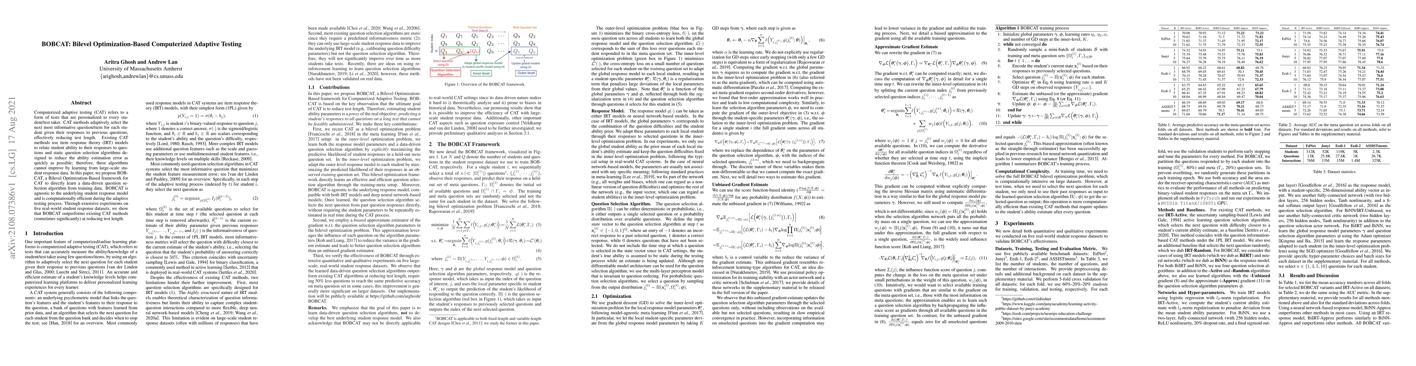 BOBCAT introduces a Bilevel Optimization-Based framework for Computerized Adaptive Testing (CAT) that learns a data-driven question selection algorithm from training data, outperforming existing methods in reducing test length across multiple datasets. This approach is agnostic to the underlying student response model and maintains computational efficiency.