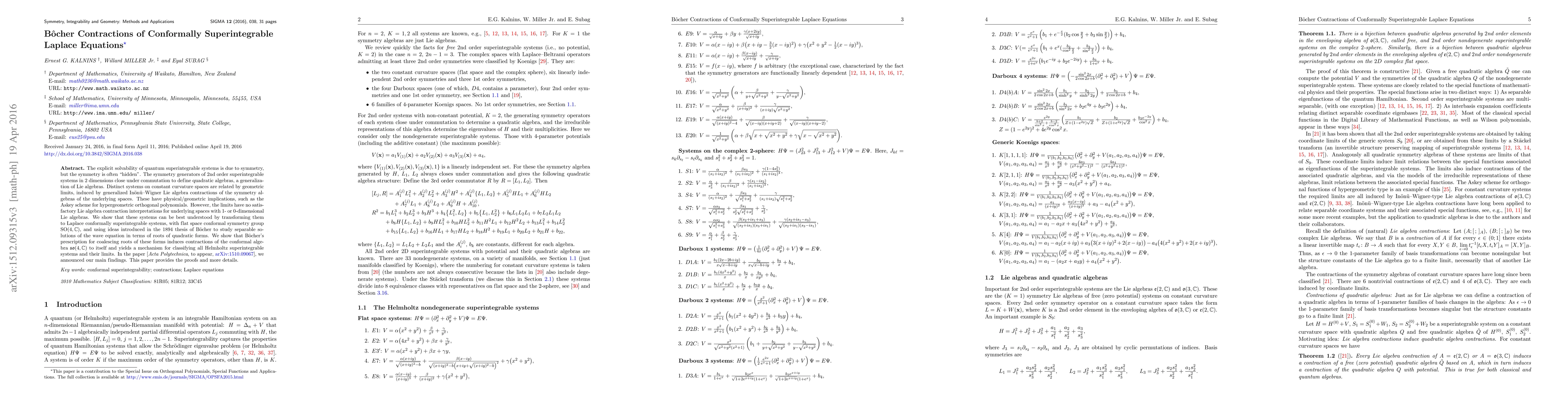 The explicit solvability of quantum superintegrable systems is due to symmetry, but the symmetry is often "hidden". The symmetry generators of 2nd order superintegrable systems in 2 dimensions close under commutation to define quadratic algebras, a generalization of Lie algebras. Distinct systems on constant curvature spaces are related by geometric limits, induced by generalized In\"on\"u-Wigner Lie algebra contractions of the symmetry algebras of the underlying spaces. These have physical/geometric implications, such as the Askey scheme for hypergeometric orthogonal polynomials. However, the limits have no satisfactory Lie algebra contraction interpretations for underlying spaces with 1- or 0-dimensional Lie algebras. We show that these systems can be best understood by transforming them to Laplace conformally superintegrable systems, with flat space conformal symmetry group ${\rm SO}(4,{\mathbb C})$, and using ideas introduced in the 1894 thesis of B\^ocher to study separable solutions of the wave equation in terms of roots of quadratic forms. We show that B\^ocher's prescription for coalescing roots of these forms induces contractions of the conformal algebra $\mathfrak{so}(4,{\mathbb C})$ to itself and yields a mechanism for classifying all Helmholtz superintegrable systems and their limits. In the paper [Acta Polytechnica, to appear, arXiv:1510.09067], we announced our main findings. This paper provides the proofs and more details.