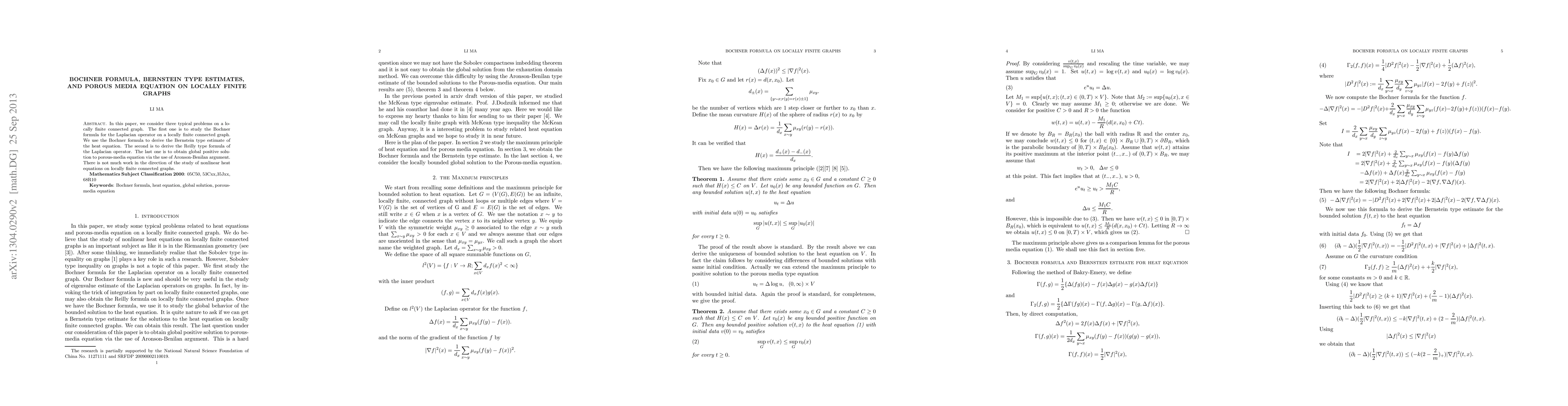 In this paper, we consider three typical problems on a locally finite connected graph. The first one is to study the Bochner formula for the Laplacian operator on a locally finite connected graph. We use the Bochner formula to derive the Bernstein type estimate of the heat equation. The second is to derive the Reilly type formula of the Laplacian operator. The last one is to obtain global positive solution to porous-media equation via the use of Aronson-Benilan argument. There is not much work in the direction of the study of nonlinear heat equations on locally finite connected graphs.