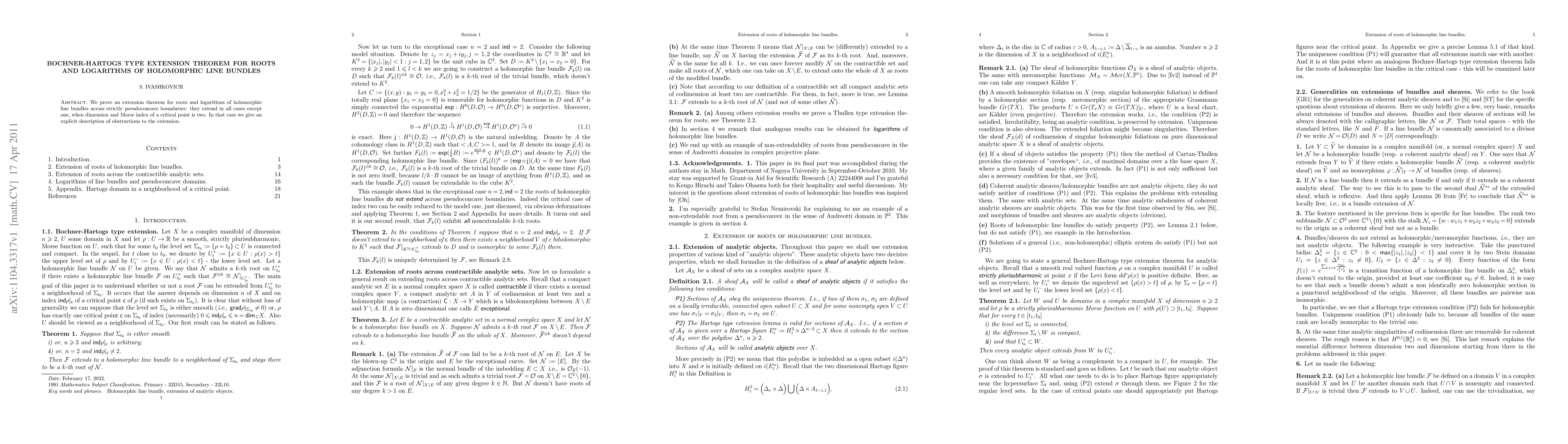 This research proves an extension theorem for roots and logarithms of holomorphic line bundles across strictly pseudoconcave boundaries, except when dimension and Morse index of a critical point equals two. In the exceptional case, it provides an explicit description of obstructions to extension.
