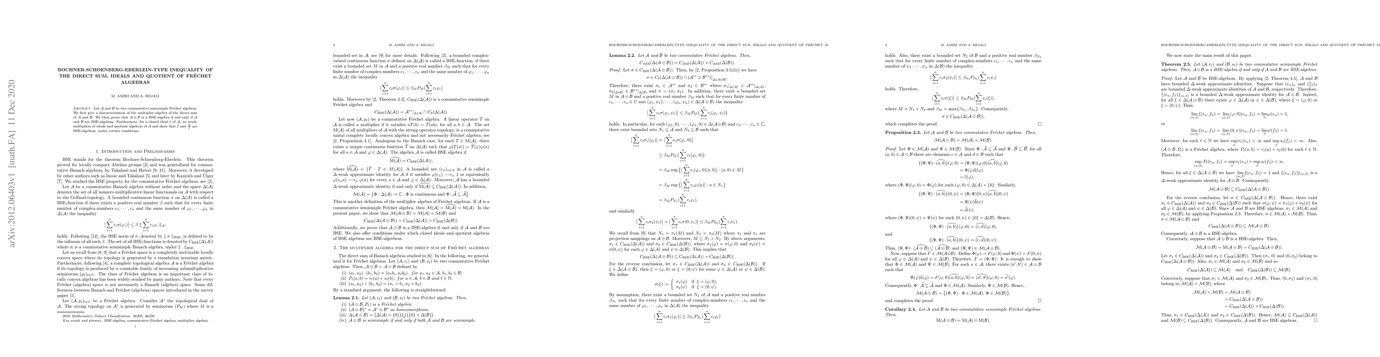 Summary: This paper characterizes the multiplier algebra of the direct sum of two commutative semisimple Frechet algebras and proves that the direct sum is a Bochner-Schoenberg-Eberlein (BSE) algebra if both constituent algebras are BSE-algebras. It also examines multipliers in the context of ideals and quotient algebras of a Frechet algebra under specific conditions.