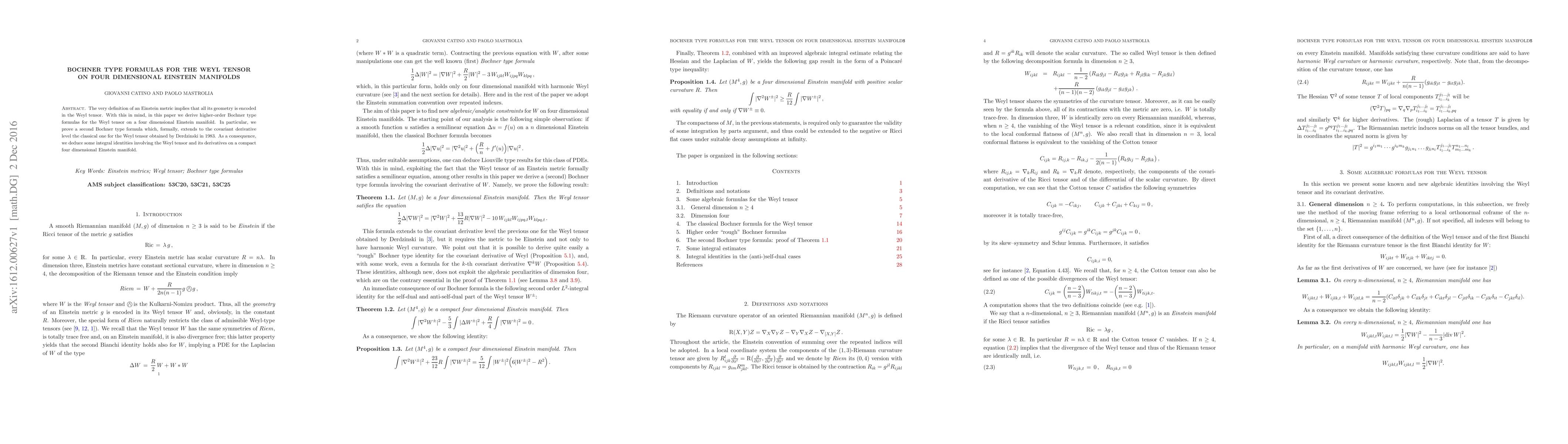 Summary: This paper derives higher-order Bochner type formulas for the Weyl tensor on four-dimensional Einstein manifolds, extending classical results and leading to new integral identities involving the Weyl tensor and its derivatives on compact manifolds.