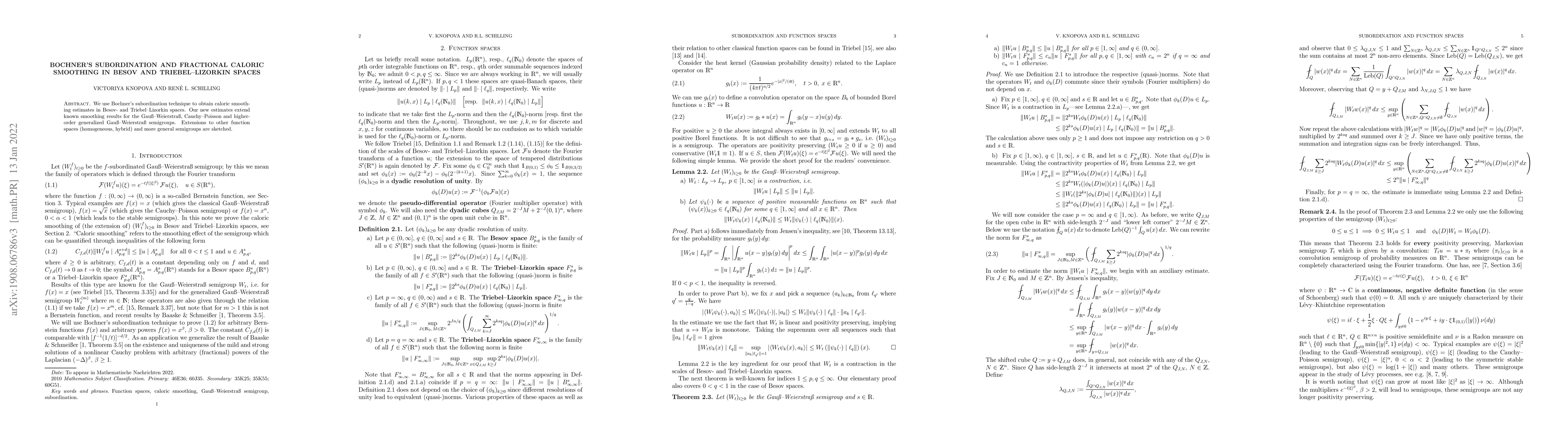This paper utilizes Bochner's subordination method to derive new caloric smoothing estimates in Besov and Triebel-Lizorkin spaces, extending existing results for various generalized Gauss-Weierstrass semigroups. Potential future extensions to other function spaces and more general semigroups are also discussed.