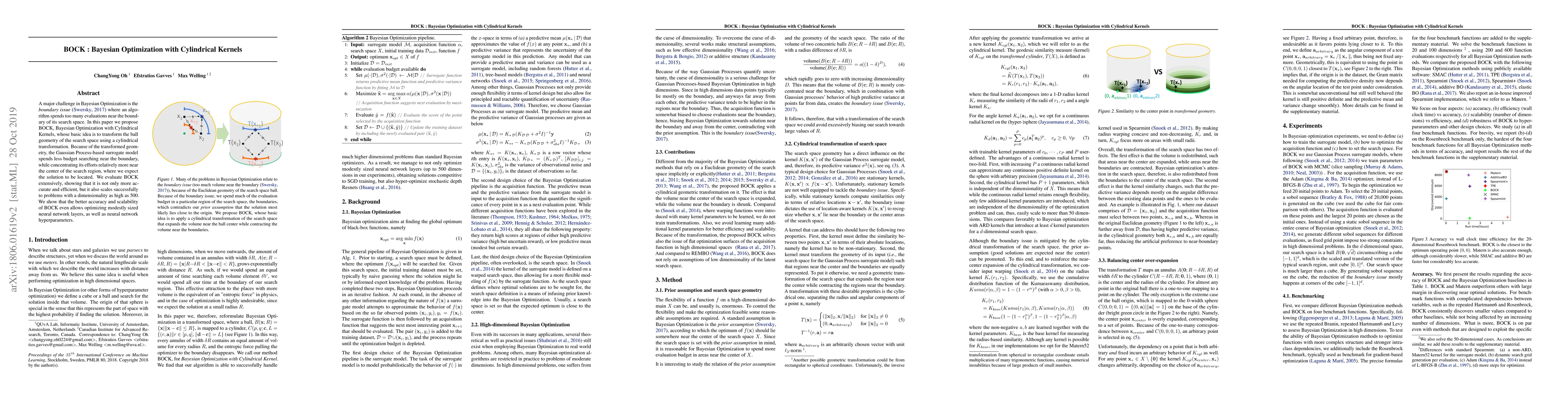 A major challenge in Bayesian Optimization is the boundary issue (Swersky, 2017) where an algorithm spends too many evaluations near the boundary of its search space. In this paper, we propose BOCK, Bayesian Optimization with Cylindrical Kernels, whose basic idea is to transform the ball geometry of the search space using a cylindrical transformation. Because of the transformed geometry, the Gaussian Process-based surrogate model spends less budget searching near the boundary, while concentrating its efforts relatively more near the center of the search region, where we expect the solution to be located. We evaluate BOCK extensively, showing that it is not only more accurate and efficient, but it also scales successfully to problems with a dimensionality as high as 500. We show that the better accuracy and scalability of BOCK even allows optimizing modestly sized neural network layers, as well as neural network hyperparameters.