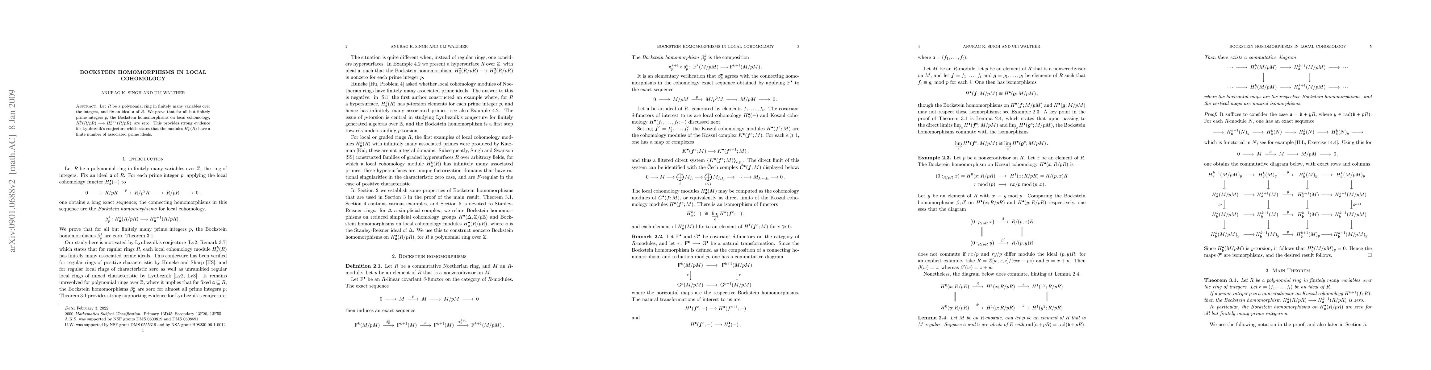 Summary: The paper proves that Bockstein homomorphisms in local cohomology vanish for all but finitely many prime integers, supporting Lyubeznik's conjecture about the finiteness of associated primes of local cohomology modules.