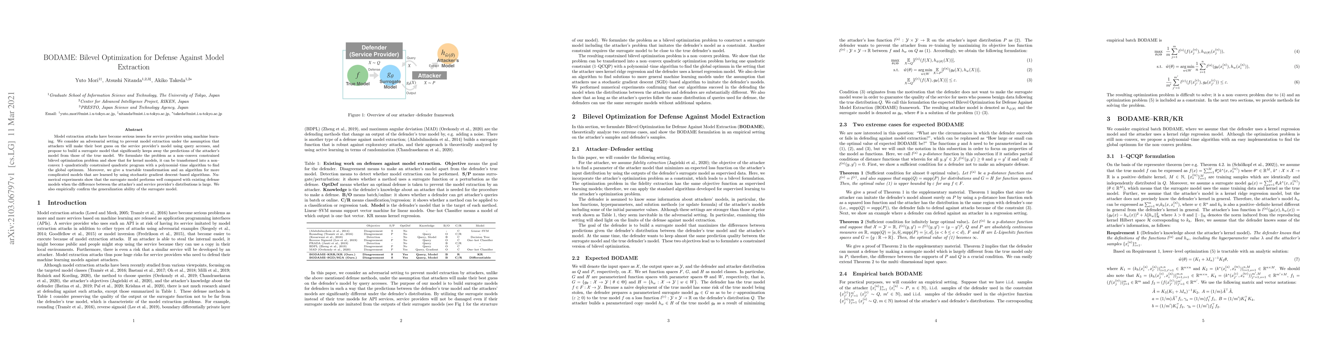 Model extraction attacks have become serious issues for service providers using machine learning. We consider an adversarial setting to prevent model extraction under the assumption that attackers will make their best guess on the service provider's model using query accesses, and propose to build a surrogate model that significantly keeps away the predictions of the attacker's model from those of the true model. We formulate the problem as a non-convex constrained bilevel optimization problem and show that for kernel models, it can be transformed into a non-convex 1-quadratically constrained quadratic program with a polynomial-time algorithm to find the global optimum. Moreover, we give a tractable transformation and an algorithm for more complicated models that are learned by using stochastic gradient descent-based algorithms. Numerical experiments show that the surrogate model performs well compared with existing defense models when the difference between the attacker's and service provider's distributions is large. We also empirically confirm the generalization ability of the surrogate model.