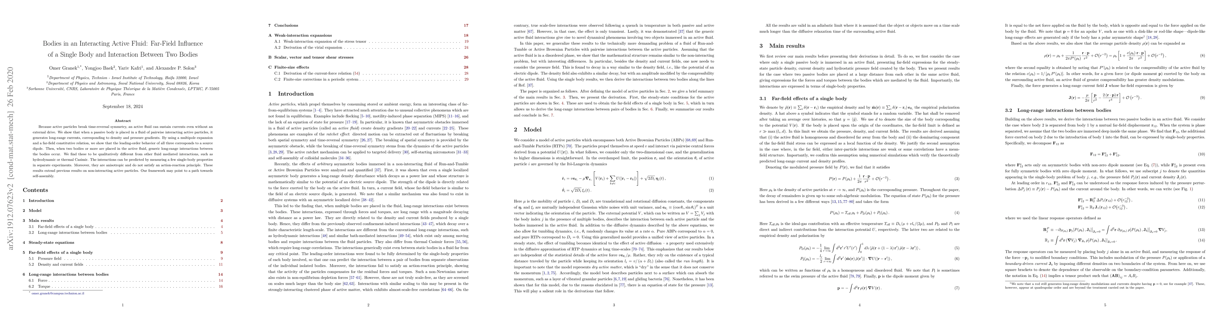 Because active particles break time-reversal symmetry, an active fluid can sustain currents even without an external drive. We show that when a passive body is placed in a fluid of pairwise interacting active particles, it generates long-range currents, corresponding to density and pressure gradients. By using a multipole expansion and a far-field constitutive relation, we show that the leading-order behavior of all three corresponds to a source dipole. Then, when two bodies or more are placed in the active fluid, generic long-range interactions between the bodies occur. We find these to be qualitatively different from other fluid mediated interactions, such as hydrodynamic or thermal Casimir. The interactions can be predicted by measuring a few single-body properties in separate experiments. Moreover, they are anisotropic and do not satisfy an action-reaction principle. These results extend previous results on non-interacting active particles. Our framework may point to a path towards self-assembly.