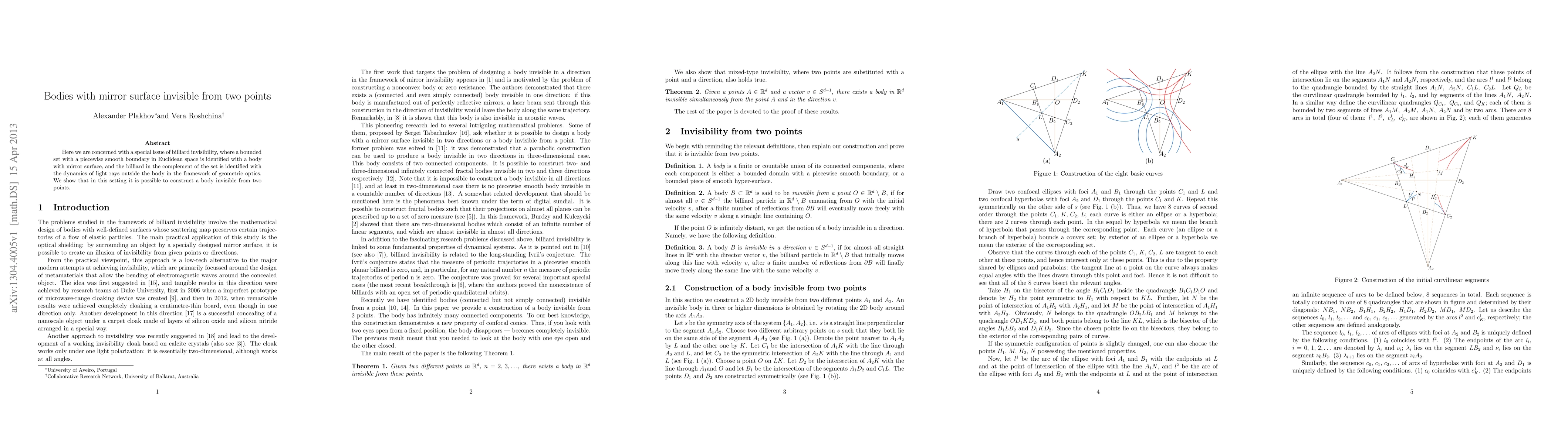 Here we are concerned with a special issue of billiard invisibility, where a bounded set with a piecewise smooth boundary in Euclidean space is identified with a body with mirror surface, and the billiard in the complement of the set is identified with the dynamics of light rays outside the body in the framework of geometric optics. We show that in this setting it is possible to construct a body invisible from two points.