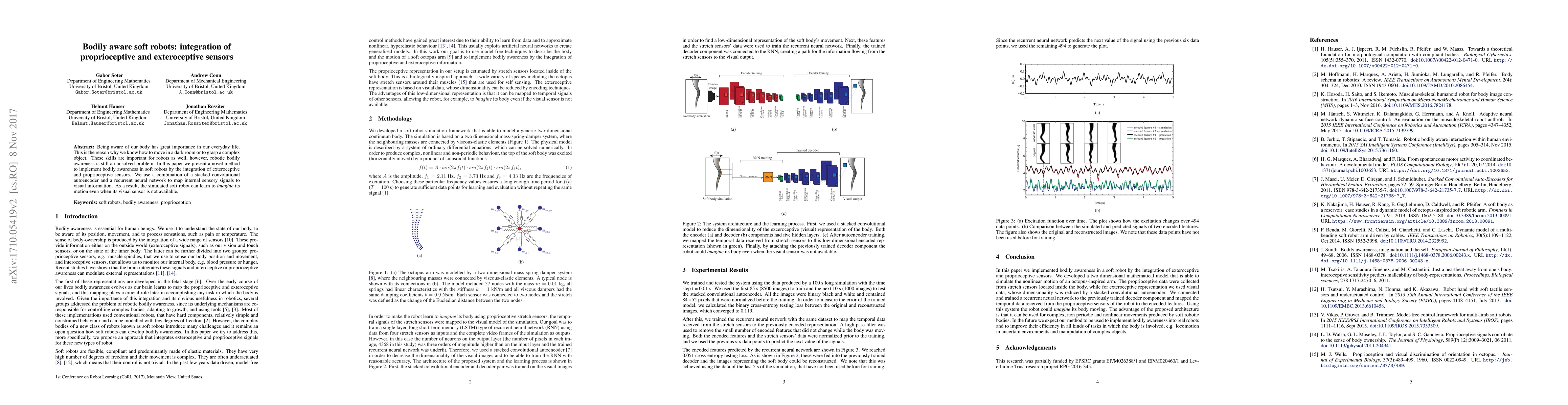 This paper introduces a novel method for integrating exteroceptive and proprioceptive sensors to enhance bodily awareness in soft robots. By employing a combination of a stacked convolutional autoencoder and a recurrent neural network, the method enables the simulated soft robot to "imagine" its motion without visual input.