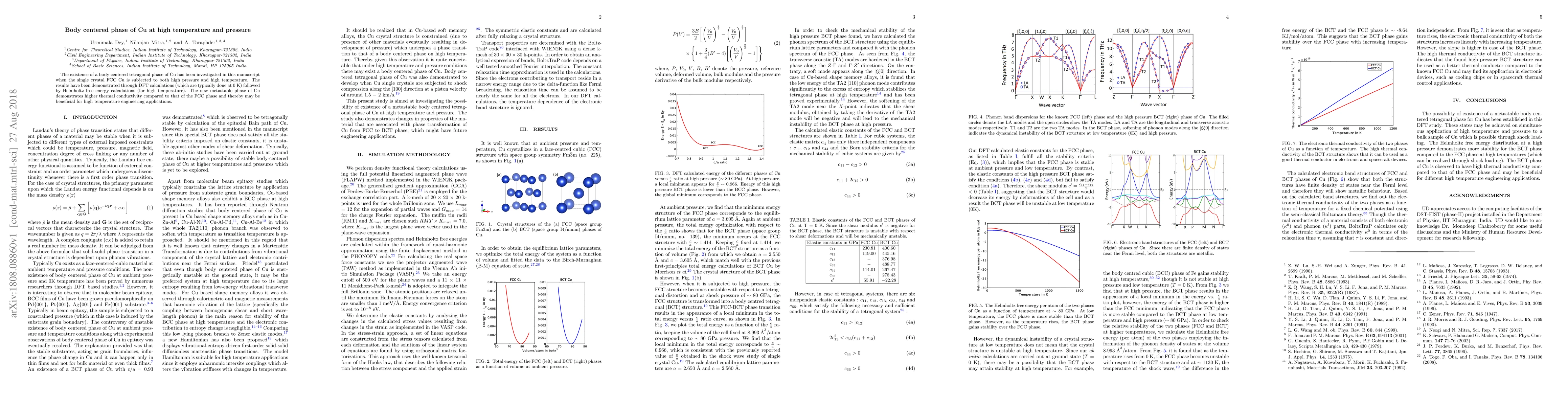 The existence of a body centered tetragonal phase of Cu has been investigated in this manuscript when the single crystal FCC Cu is subjected to both high pressure and high temperature. The results have been demonstrated through DFT calculations (which are typically done at 0 K) followed by Helmholtz free energy calculations (for high temperature). The new metastable phase of Cu demonstrates higher thermal conductivity compared to that of the FCC phase and thereby may be beneficial for high temperature engineering applications.