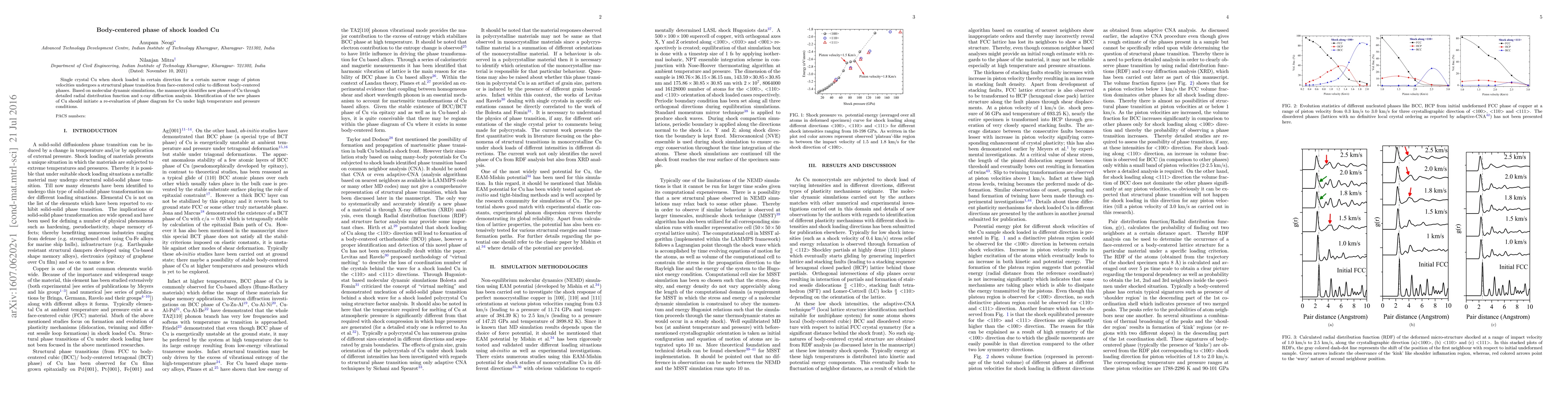 Single crystal Cu when shock loaded in certain direction for a certain narrow range of piston velocities undergoes a structural phase transition from face-centered cubic to different body-centered phases. Based on molecular dynamic simulations, the manuscript identifies new phases of Cu through detailed radial distribution function and x-ray diffraction analysis. Identification of the new phases of Cu should initiate a re-evaluation of phase diagram for Cu under high temperature and pressure conditions.