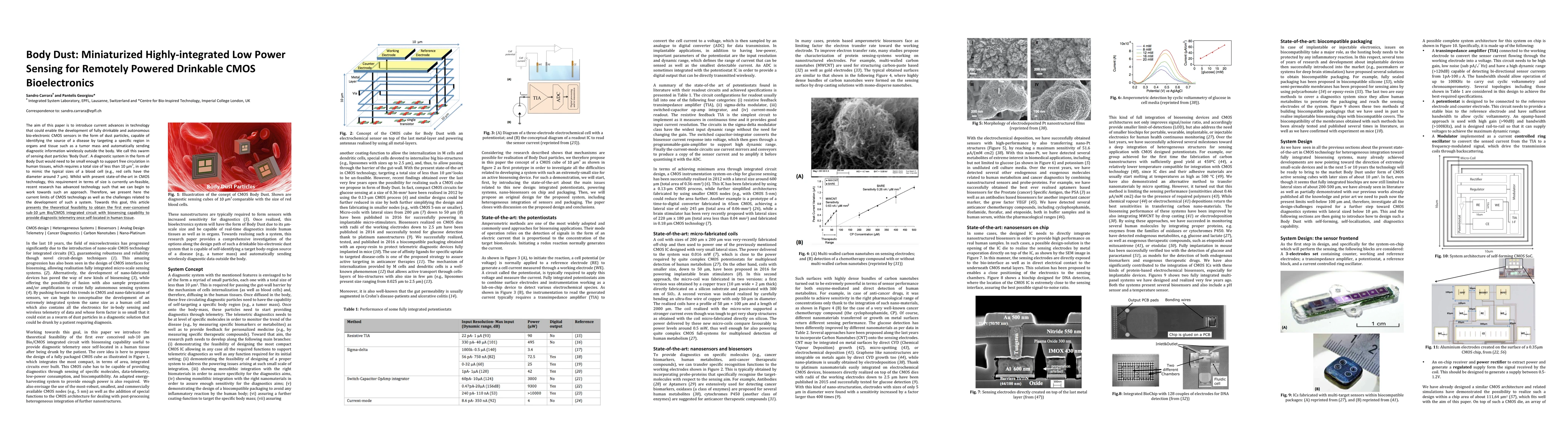 The aim of this paper is to introduce current advances in technology that could enable the development of fully drinkable and autonomous bio-electronic CMOS sensors in the form of dust particles, capable of identifying the source of a disease by targeting a specific region in organs and tissue such as a tumor mass and automatically sending diagnostic information wirelessly outside the body. We call this swarm of sensing dust particles Body Dust. A diagnostic system in the form of Body Dust would need to be small enough to support free circulation in human tissues, which requires a total size of less than 10 um3, in order to mimic the typical sizes of a blood cell (e.g., red cells have the diameter around 7 {\mu}m). Whilst with present state-of-the-art in CMOS technology, this requirement in terms of size is currently un-feasible, recent research has advanced technology such that we can begin to work towards such an approach. Therefore, we present here the current limits of CMOS technology as well as the challenges related to the development of such a system. Towards this goal, this article presents the theoretical feasibility to obtain the first ever-conceived sub-10-um Bio/CMOS integrated circuit with biosensing capability to provide diagnostic telemetry once self-located in human tissue.