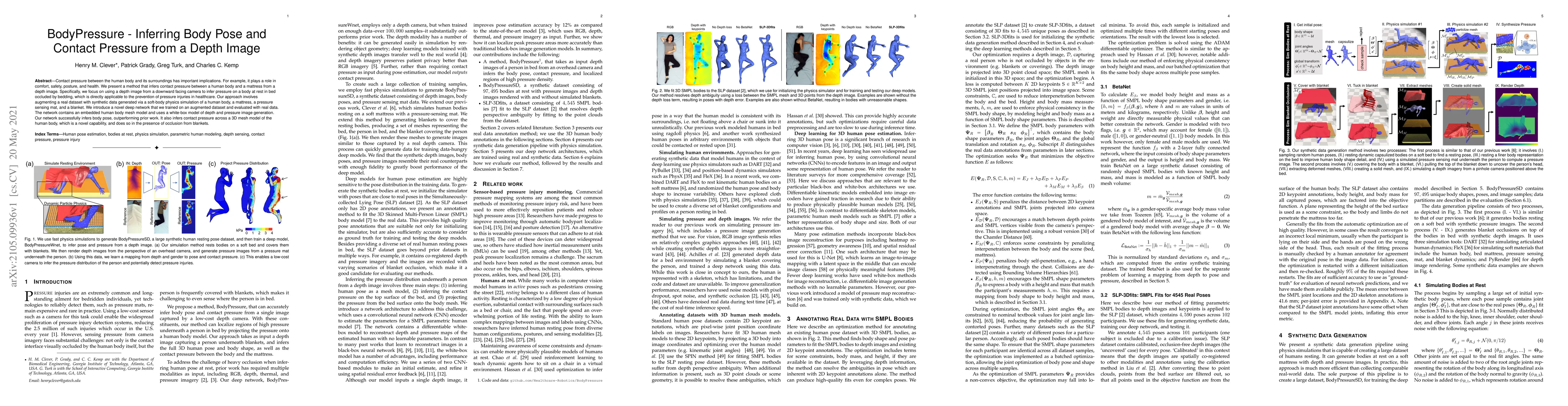 A method infers contact pressure from a depth image to prevent pressure injuries in healthcare, successfully predicting body pose and pressure across a 3D human body model.