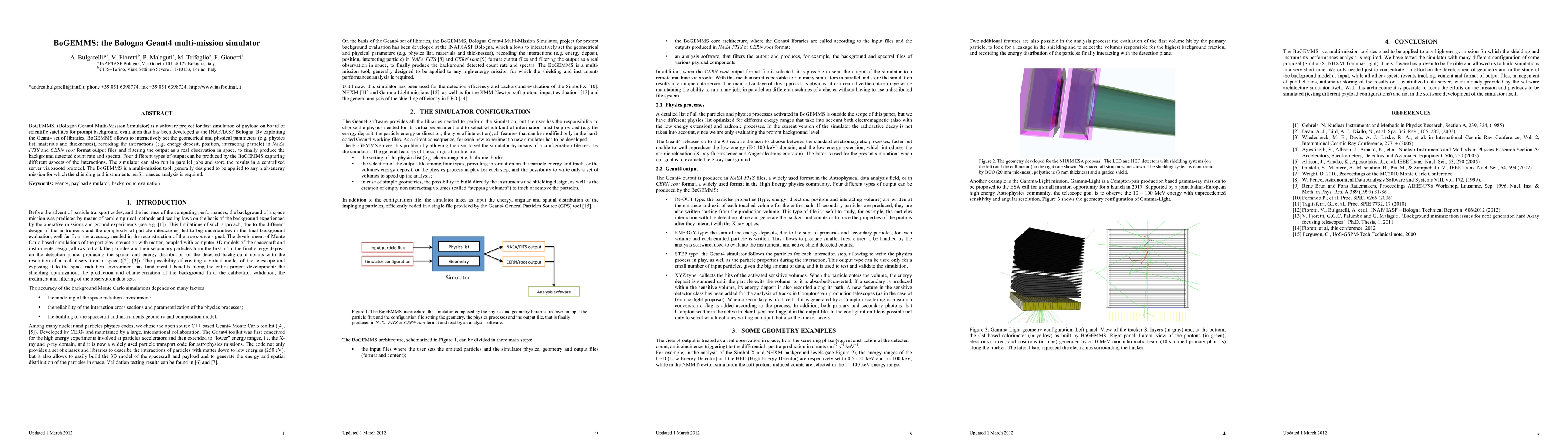 BoGEMMS, (Bologna Geant4 Multi-Mission Simulator) is a software project for fast simulation of payload on board of scientific satellites for prompt background evaluation that has been developed at the INAF/IASF Bologna. By exploiting the Geant4 set of libraries, BoGEMMS allows to interactively set the geometrical and physical parameters (e.g. physics list, materials and thicknesses), recording the interactions (e.g. energy deposit, position, interacting particle) in NASA FITS and CERN root format output files and filtering the output as a real observation in space, to finally produce the background detected count rate and spectra. Four different types of output can be produced by the BoGEMMS capturing different aspects of the interactions. The simulator can also run in parallel jobs and store the results in a centralized server via xrootd protocol. The BoGEMMS is a multi-mission tool, generally designed to be applied to any high-energy mission for which the shielding and instruments performances analysis is required.
