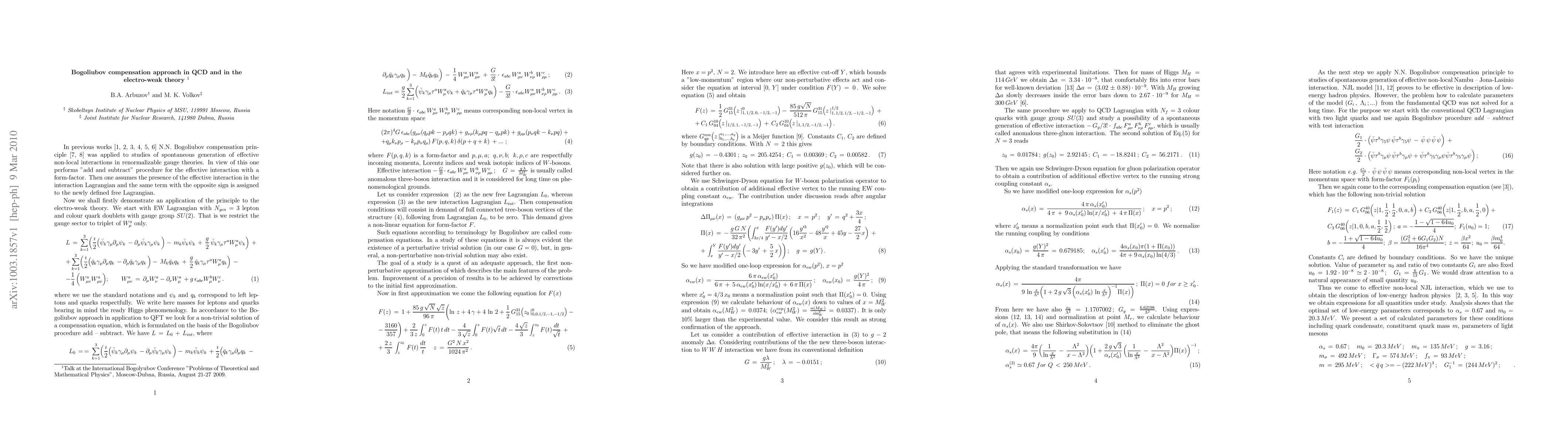 We describe application of Bogoliubov compensation principle to calculation of non-perturbative contribution in the electroweak theory and QCD. We obtain unique solutions of compensation equations, which impose strong restrictions on parameters of theories and on functional dependence of corresponding form-factors. We calculate value of running gauge electroweak coupling $\alpha_w(M_W)=0.0374$, that differs from the experimental value less than by 10%. We derive effective Nambu-Jona-Lasinio interaction from fundamental QCD and express its parameters in terms of initial QCD parameters: $\alpha_s$ at low-momenta and current mass of light quarks. This leads to satisfactory description of low-mass hadron physics.
