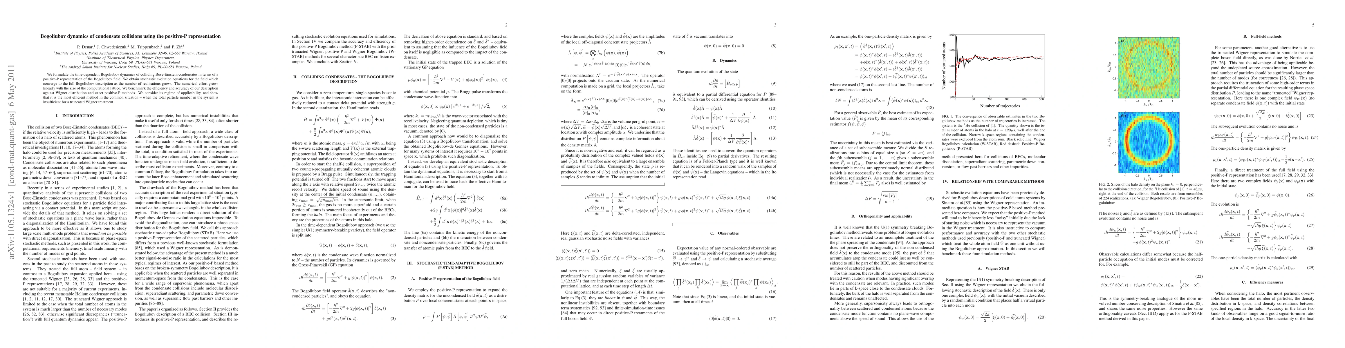 This paper formulates the dynamics of colliding Bose-Einstein condensates using a positive-P representation of the Bogoliubov field, deriving stochastic evolution equations that converge to the full Bogoliubov description. The method proves efficient and accurate, especially for systems with insufficient total particles for truncated Wigner treatment.