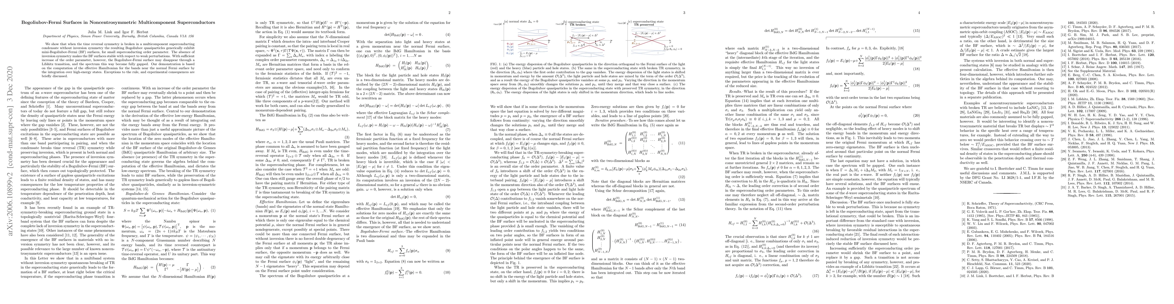 We show that when the time reversal symmetry is broken in a multicomponent superconducting condensate without inversion symmetry the resulting Bogoliubov quasiparticles generically exhibit mini-Bogoliubov-Fermi (BF) surfaces, for small superconducting order parameter. The absence of inversion symmetry makes the BF surfaces stable with respect to weak perturbations. With sufficient increase of the order parameter, however, the Bogoliubov-Fermi surface may disappear through a Lifshitz transition, and the spectrum this way become fully gapped. Our demonstration is based on the computation of the effective Hamiltonian for the bands near the normal Fermi surface by the integration over high-energy states. Exceptions to the rule, and experimental consequences are briefly discussed.