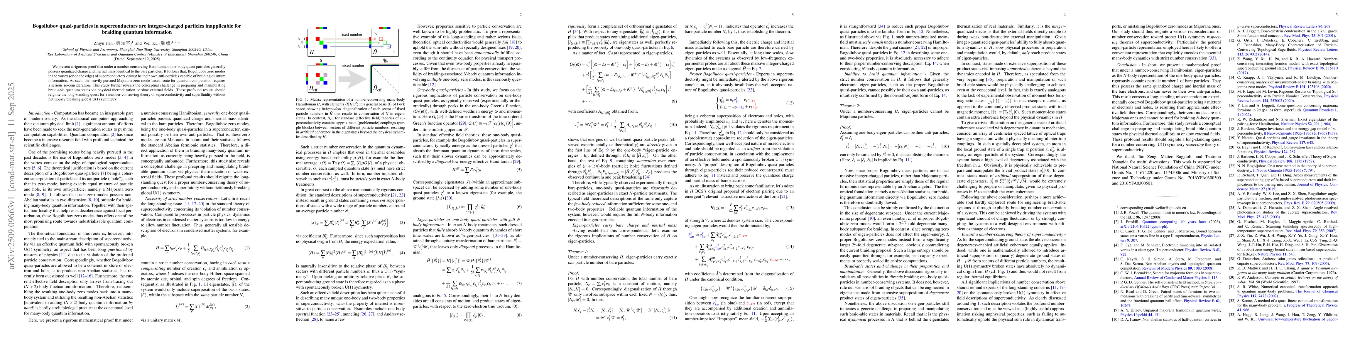 We present a rigorous proof that under a number-conserving Hamiltonian, one-body quasi-particles generally possess quantized charge and inertial mass identical to the bare particles. It follows that, Bogoliubov zero modes in the vortex (or on the edge) of superconductors $\textit{cannot}$ be their own anti-particles capable of braiding quantum information. As such, the heavily pursued Majorana zero mode-based route for quantum computation requires a serious re-consideration. This study further reveals the conceptual challenge in preparing and manipulating braid-able quantum states via physical thermalization or slow external fields. These profound results should reignite the long-standing quest for a number-conserving theory of superconductivity and superfluidity without fictitiously breaking global U(1) symmetry.