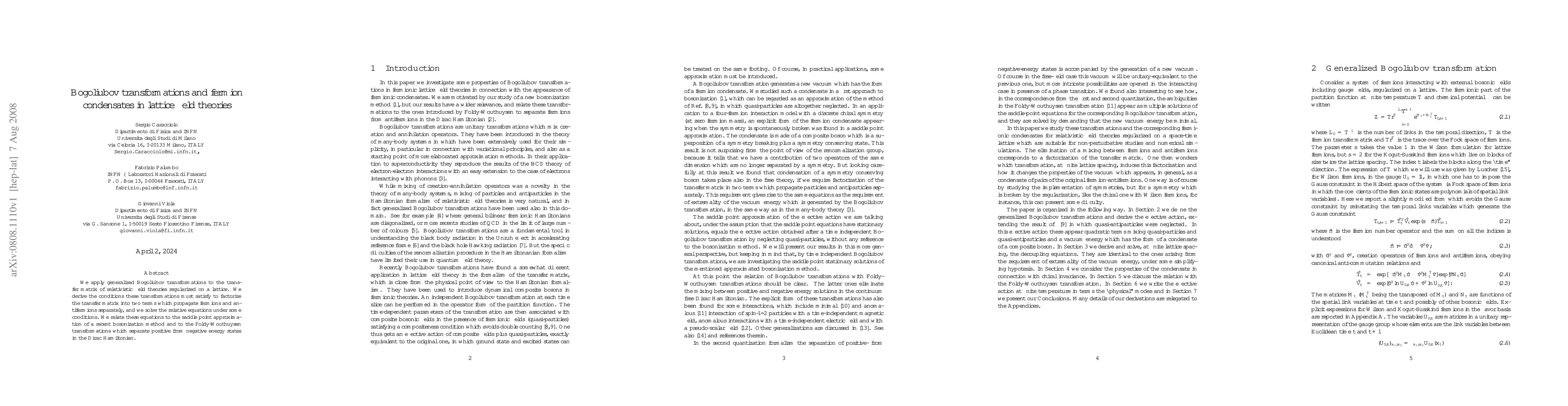 This paper applies generalized Bogoliubov transformations to lattice field theories to factorize the transfer matrix, enabling separate propagation of fermions and antifermions. The derived conditions are linked to bosonization methods and Foldy-Wouthuysen transformations, facilitating a deeper understanding of fermion condensates.