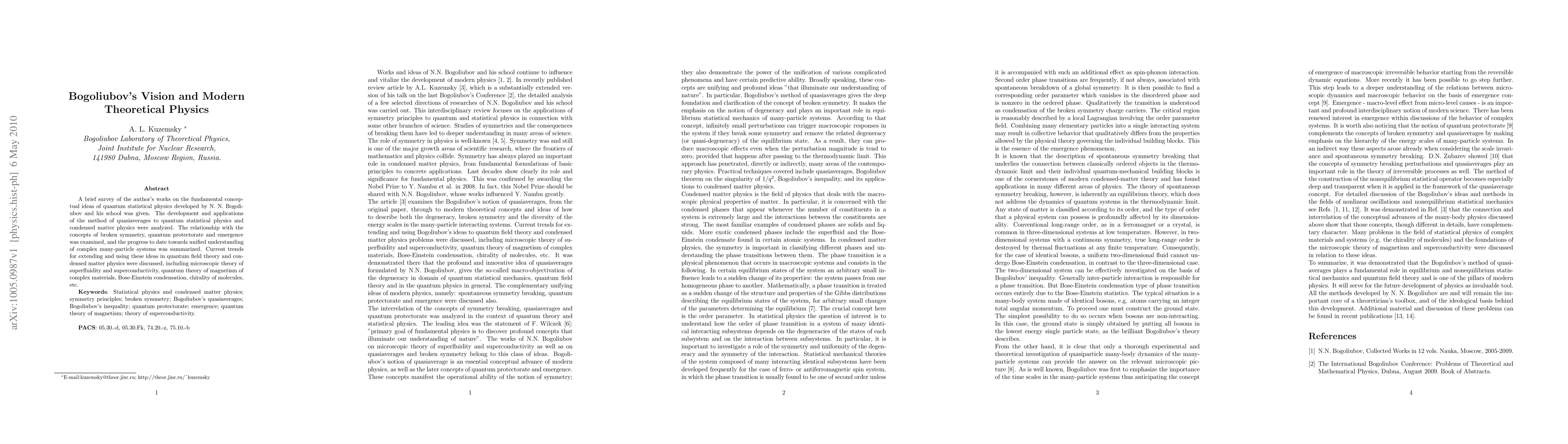 This paper surveys Bogoliubov's work on quantum statistical physics and its applications in condensed matter physics, discussing key concepts like broken symmetry and emergence, and their relevance to modern theoretical physics.