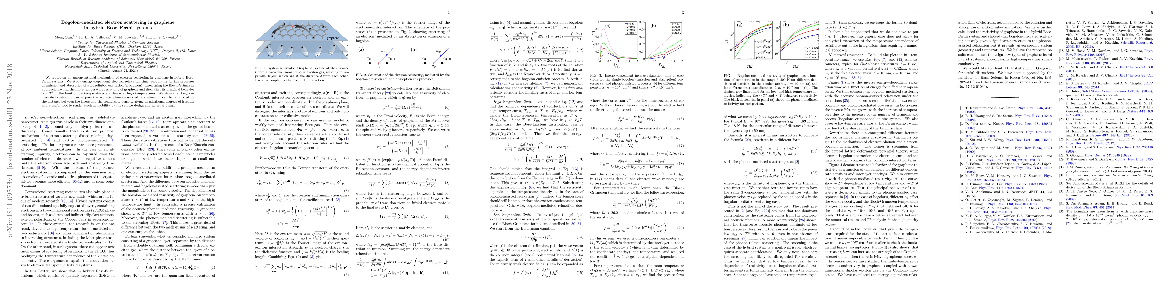 This paper investigates electron scattering in graphene within hybrid Bose-Fermi systems, revealing that bogolon-mediated scattering can dominate over acoustic phonon-assisted relaxation. The study finds that the resistivity of graphene follows a $\sim T^4$ dependence at low temperatures and becomes linear at high temperatures, offering new control over electron mobility through layer distance and condensate density.