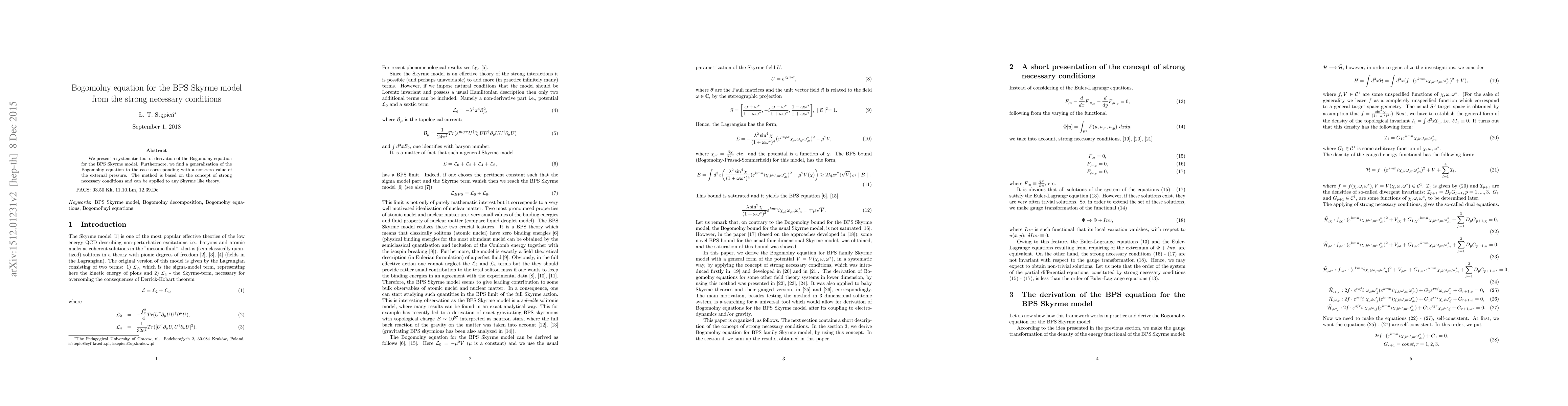 We present a systematic tool of derivation of the Bogomolny equation for the BPS Skyrme model. Furthermore, we find a generalization of the Bogomolny equation to the case corresponding with a non-zero value of the external pressure. The method is based on the concept of strong necessary conditions and can be applied to any Skyrme like theory.