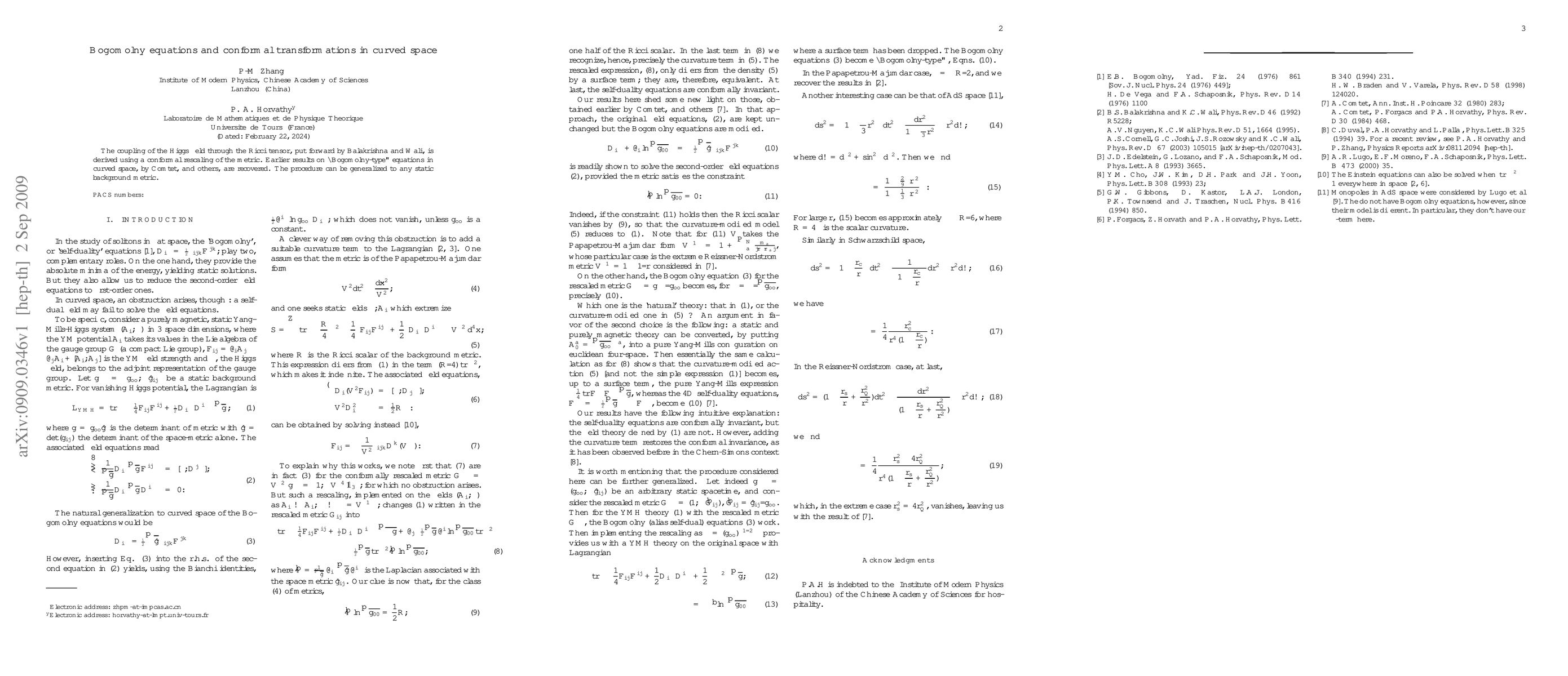 The coupling of the Higgs field through the Ricci tensor, put forward by Balakrishna and Wali, is derived using a conformal rescaling of the metric. Earlier results on "Bogomolny-type" equations in curved space, by Comtet, and others, are recovered. The procedure can be generalized to any static background metric.