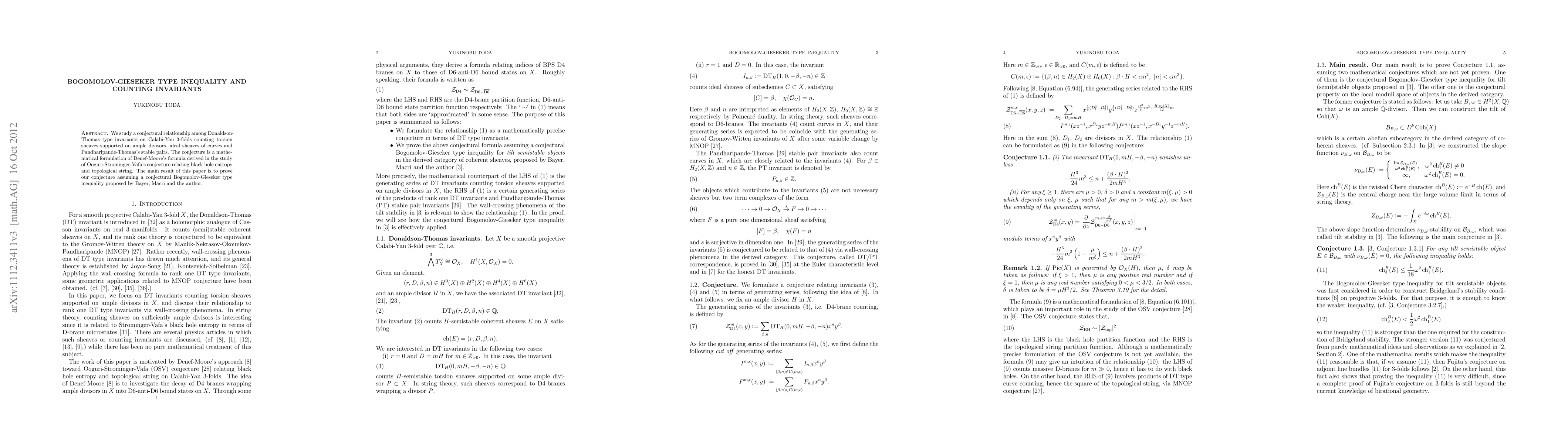 The paper introduces a novel proof technique for relating different types of invariants using Bridgeland stability conditions and a Bogomolov-Gieseker type inequality, extending previous work in the field.