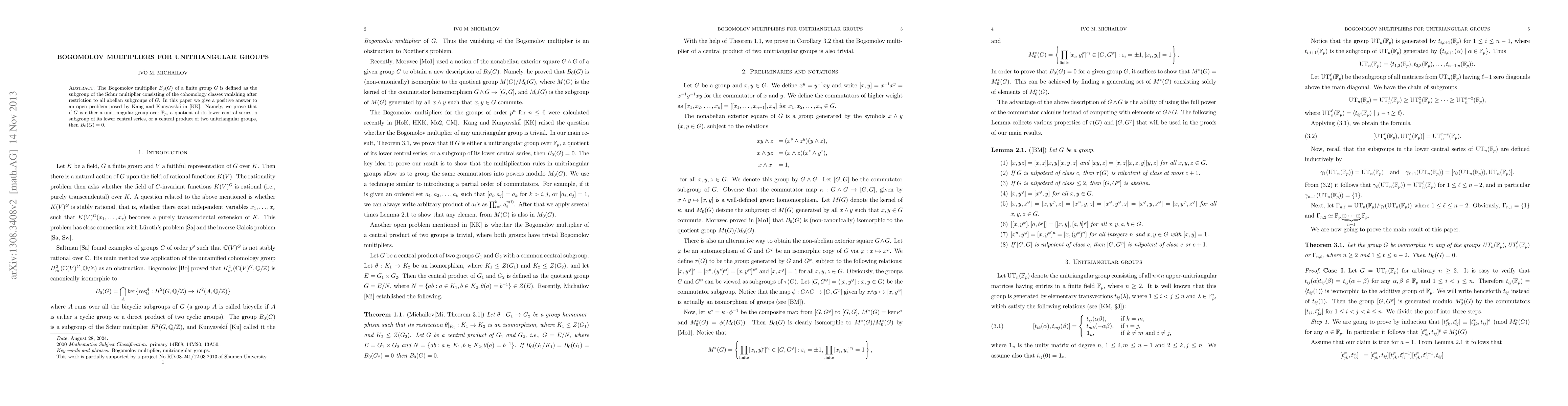 The Bogomolov multiplier $B_0(G)$ of a finite group $G$ is defined as the subgroup of the Schur multiplier consisting of the cohomology classes vanishing after restriction to all abelian subgroups of $G$. In this paper we give a positive answer to an open problem posed by Kang and Kunyavski\u{i} in \cite{KK}. Namely, we prove that if $G$ is either a unitriangular group over $\f$, a quotient of its lower central series, a subgroup of its lower central series, or a central product of two unitriangular groups, then $B_0(G)=0$.