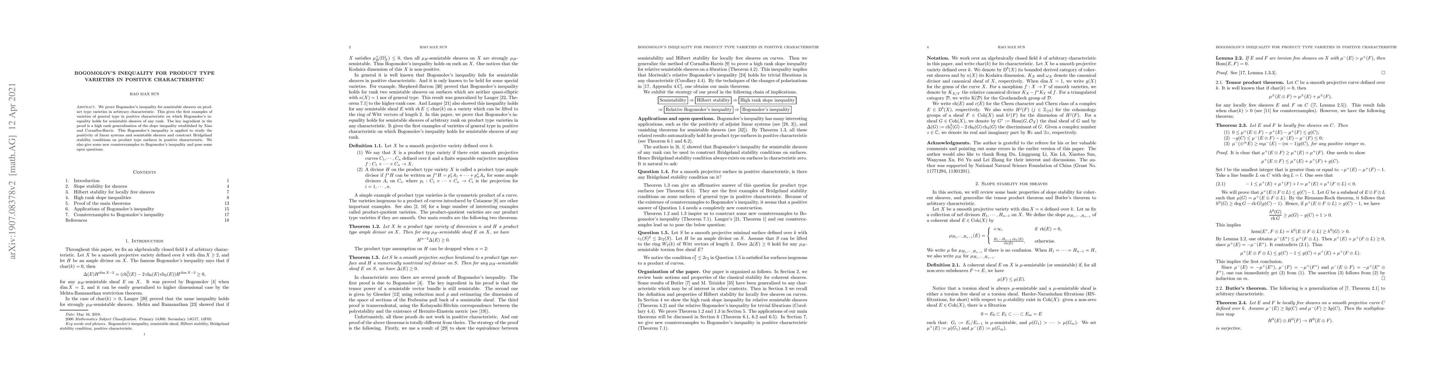 This paper proves Bogomolov's inequality for semistable sheaves on product type varieties in positive characteristic, establishing examples of such varieties with positive Kodaira dimension where the inequality holds for all ranks. The proof utilizes a high-rank generalization of slope inequality.