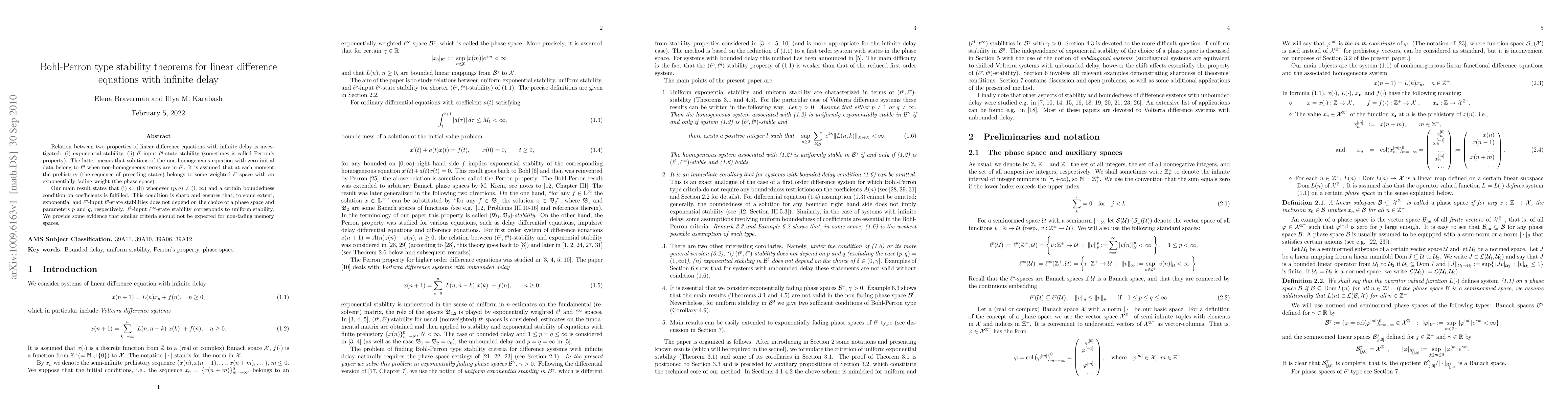 Relation between two properties of linear difference equations with infinite delay is investigated: (i) exponential stability, (ii) $\l^p$-input $\l^q$-state stability (sometimes is called Perron's property). The latter means that solutions of the non-homogeneous equation with zero initial data belong to $\l^q$ when non-homogeneous terms are in $\l^p$. It is assumed that at each moment the prehistory (the sequence of preceding states) belongs to some weighted $\l^r$-space with an exponentially fading weight (the phase space). Our main result states that (i) $\Leftrightarrow$ (ii) whenever $(p,q) \neq (1,\infty)$ and a certain boundedness condition on coefficients is fulfilled. This condition is sharp and ensures that, to some extent, exponential and $\l^p$-input $\l^q$-state stabilities does not depend on the choice of a phase space and parameters $p$ and $q$, respectively. $\l^1$-input $\l^\infty$-state stability corresponds to uniform stability. We provide some evidence that similar criteria should not be expected for non-fading memory spaces.