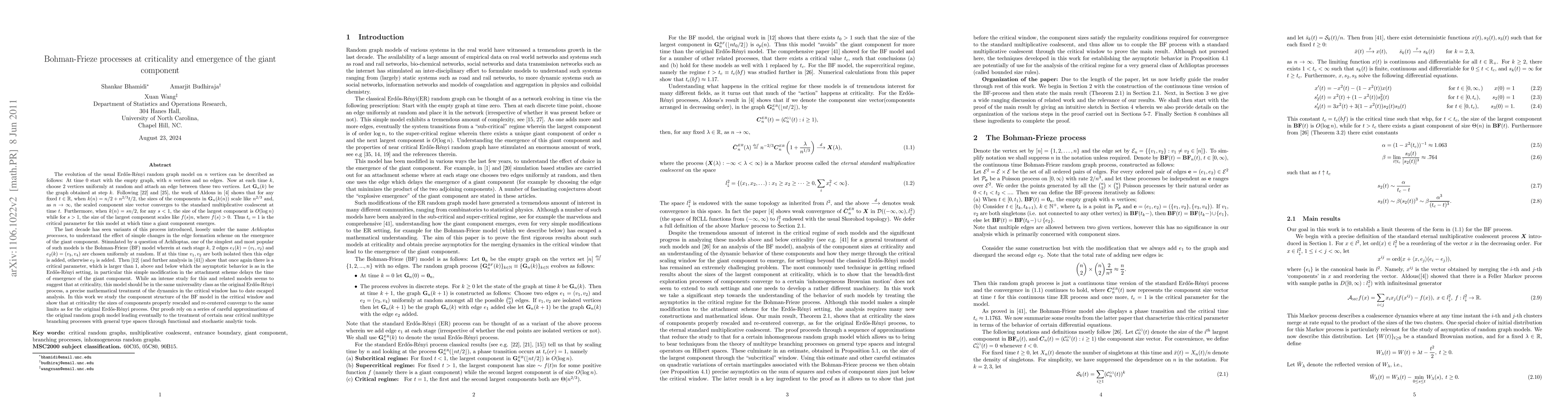 Researchers study the Bohman-Frieze process at criticality, finding that component sizes rescale to a multiplicative coalescent at this point, similar to the Erdös-Rényi model.